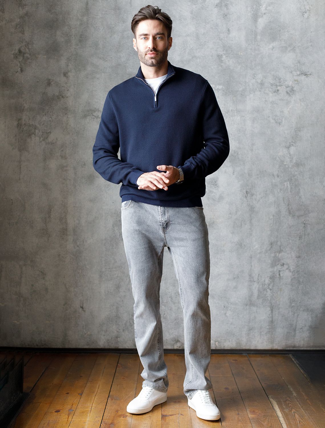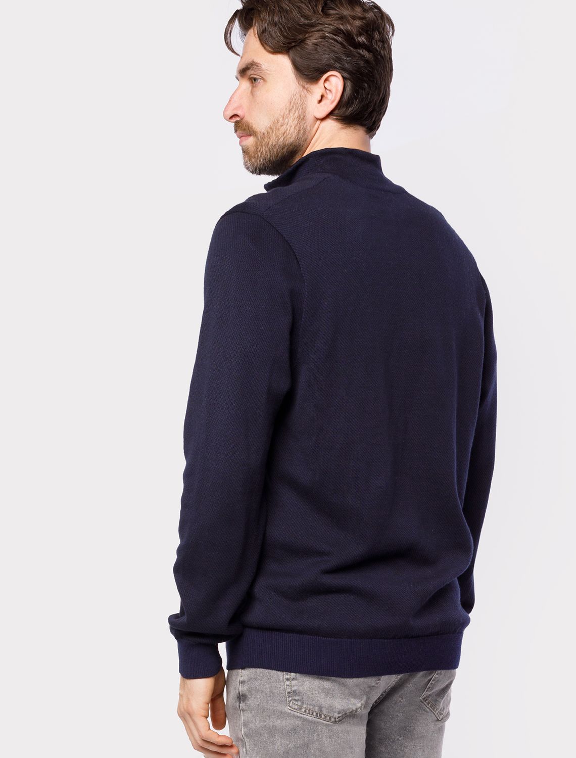 Темно-синий джемпер с длинными рукавами выполнен из мягкой хлопковой пряжи с добавлением акрила. Высокий воротник застегивается молнией. За счет переплетения светлых и темных нитей получилась фактурная меланжевая модель, которая, отлично держит тепло и почти не ощущается на теле. Сочетается с футболками, денимом и с чиносами, любой обувью.