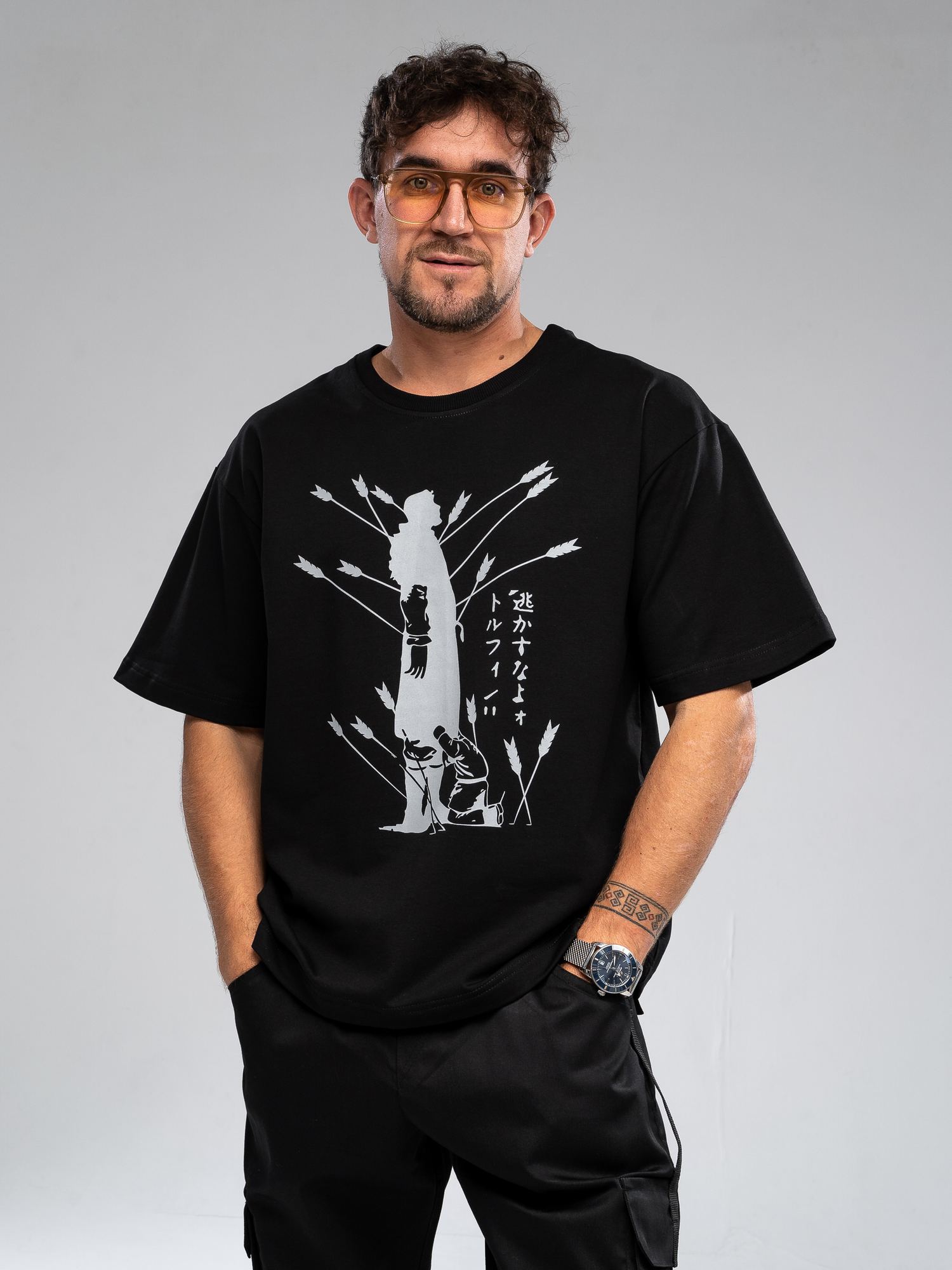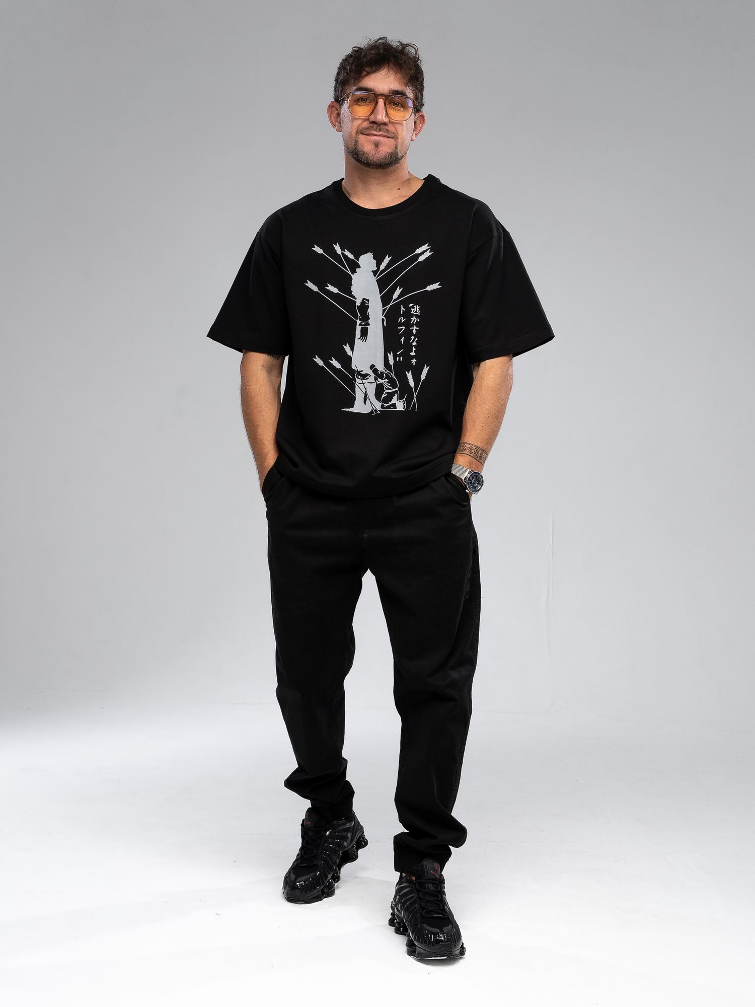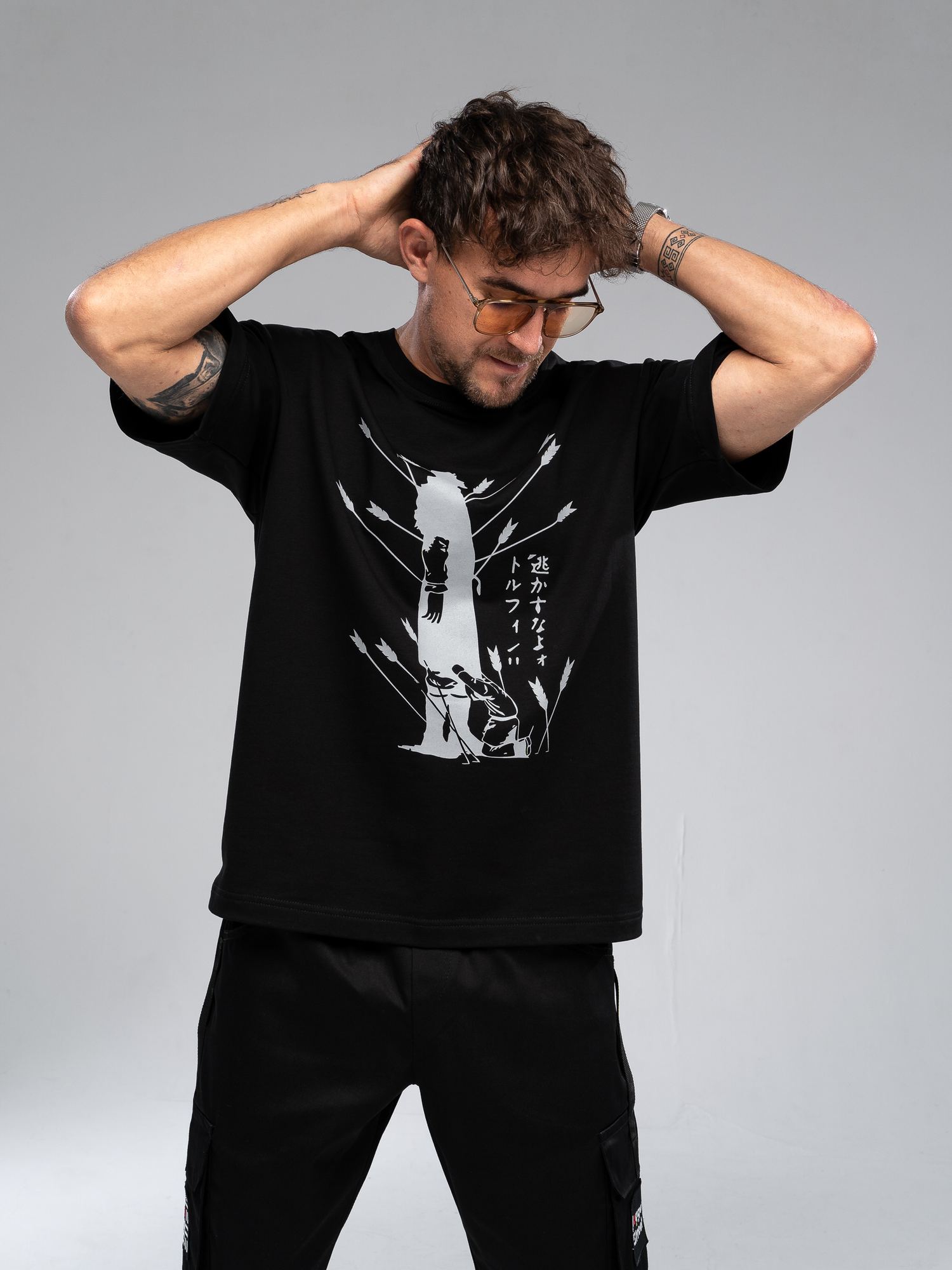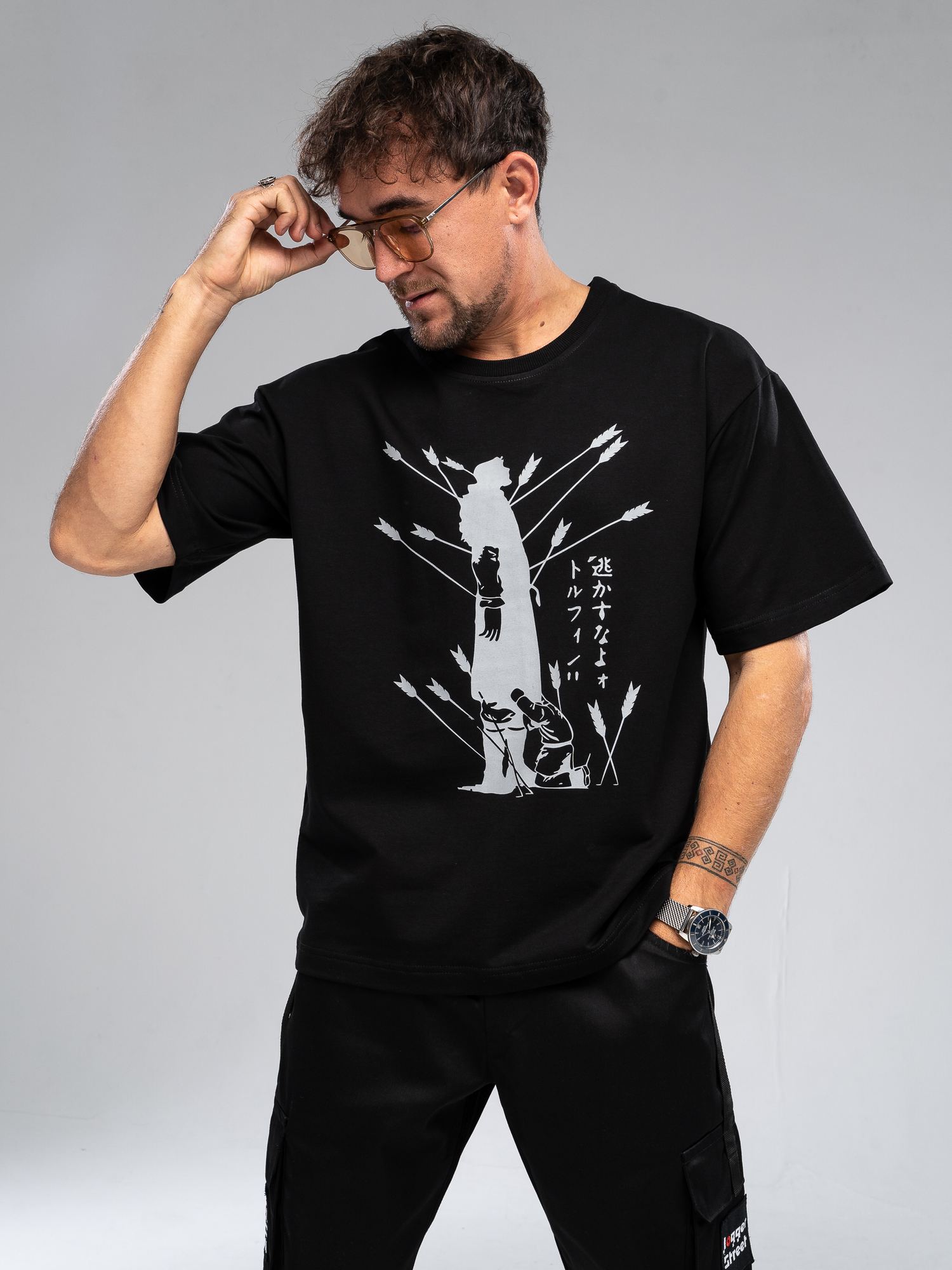 Футболка мужская из футера черного цвета свободного силуэта с короткими рукавами,круглая горловина обработана рибаной. Изделие выполнено из трикотажа премиального качества - ПЕНЬЕ, с содержанием хлопка более 92%