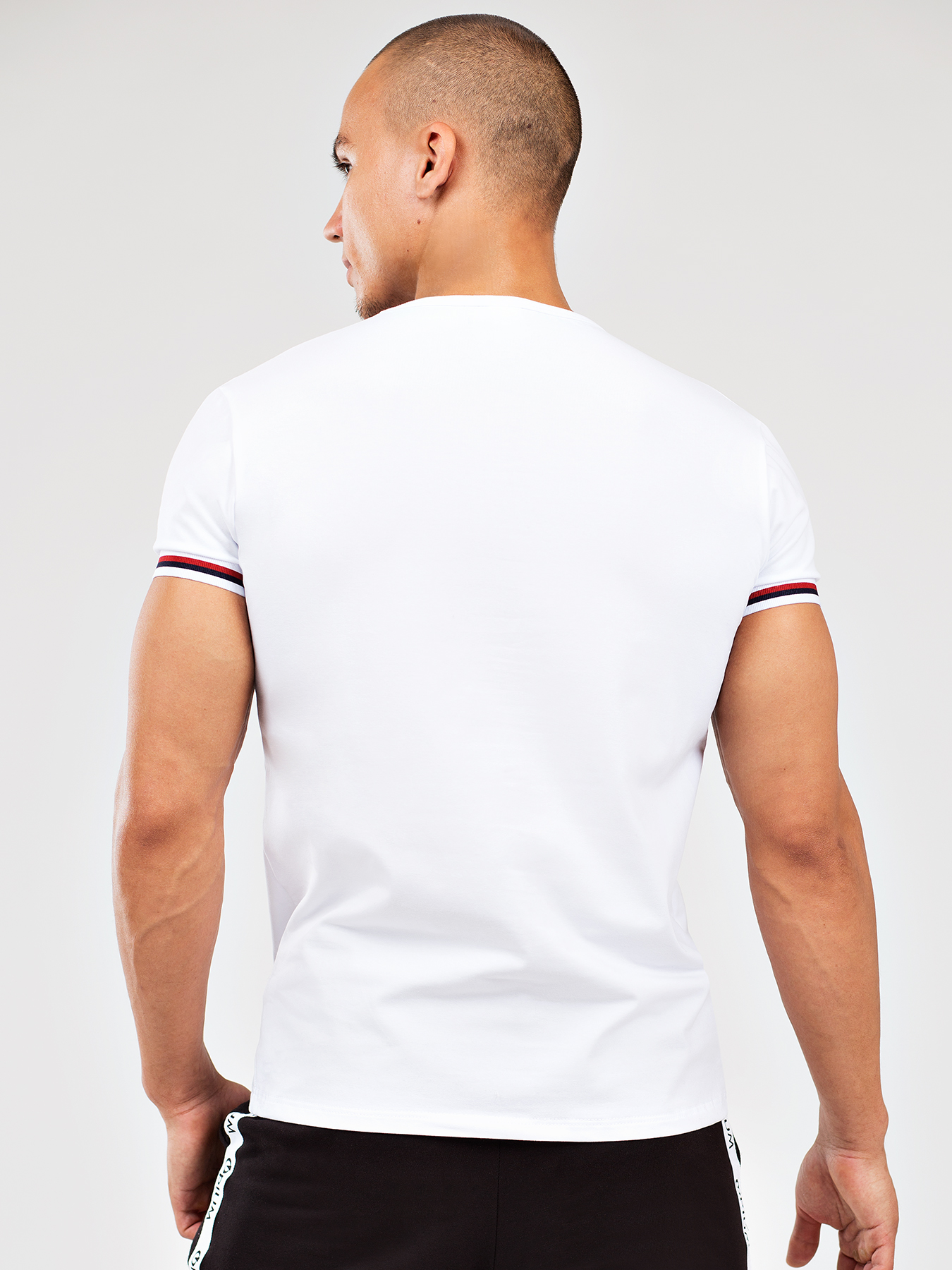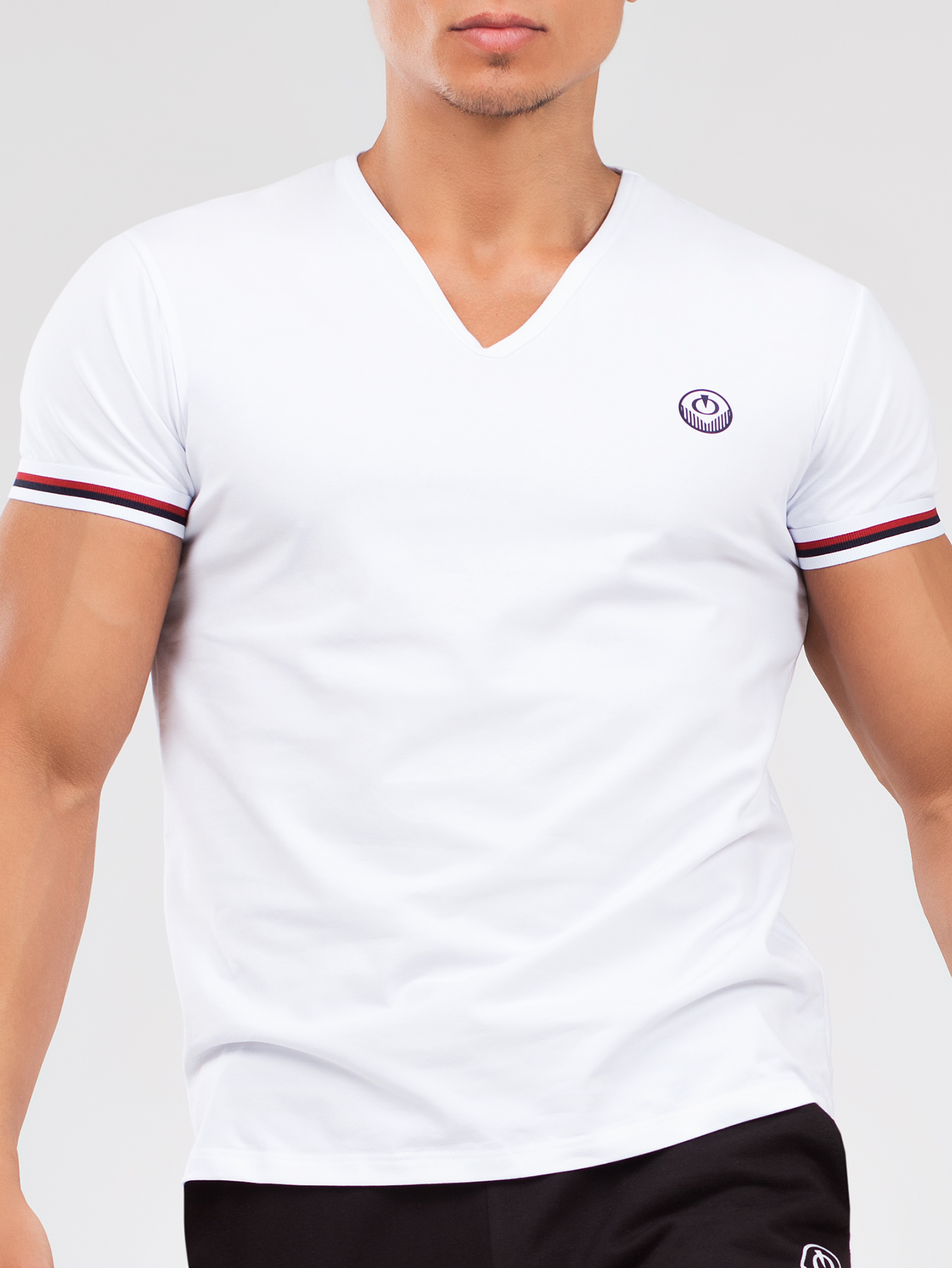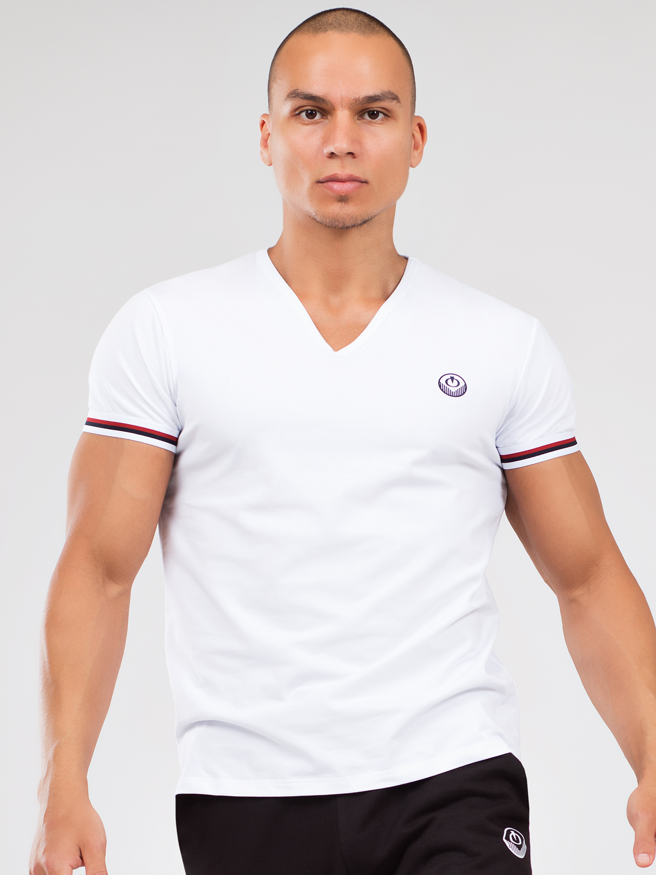 Мужская белая футболка в спортивном стиле из хлопка с эластаном. V-образный вырез горловины подчёркивает мужской торс и подходит к любому типу телосложения. Оригинальные детали: полосатая резинка по краю рукавов, вышивка-шеврон в виде фирменного логотипа, - особенности этой привлекательной модели.
