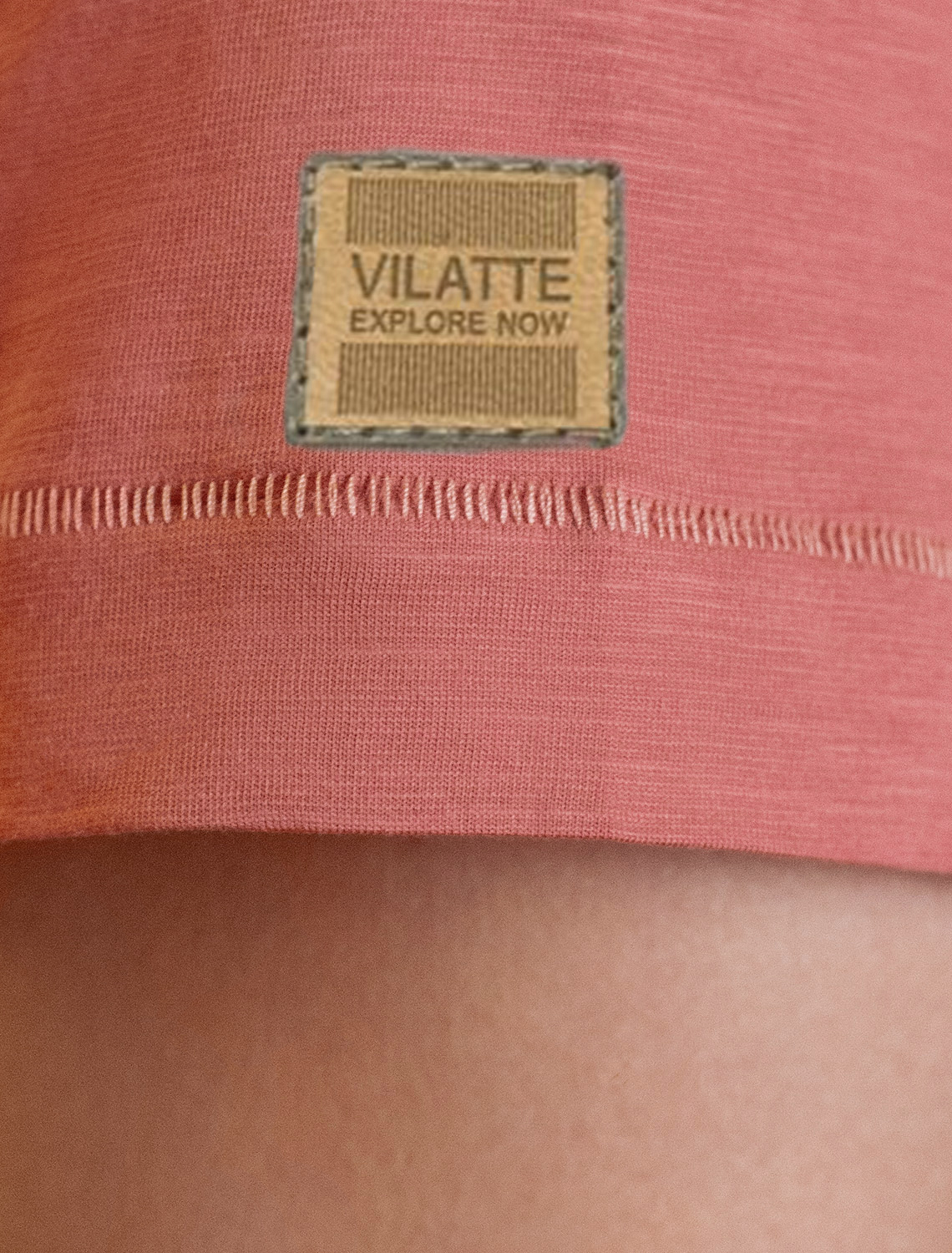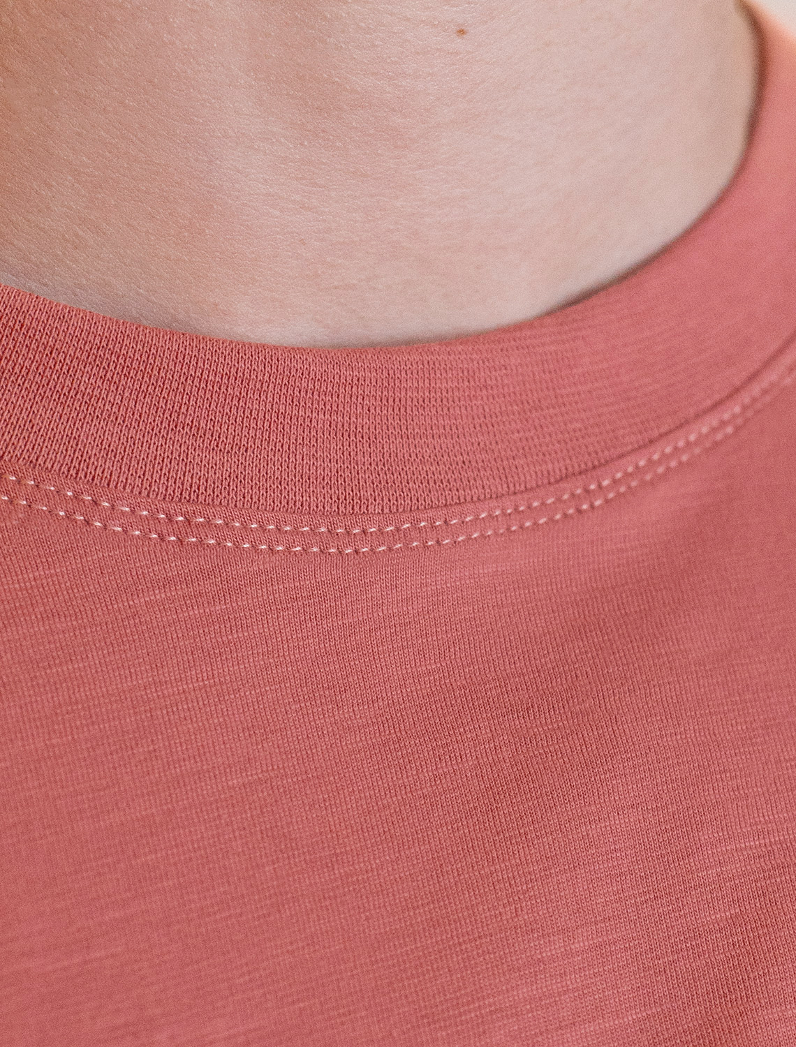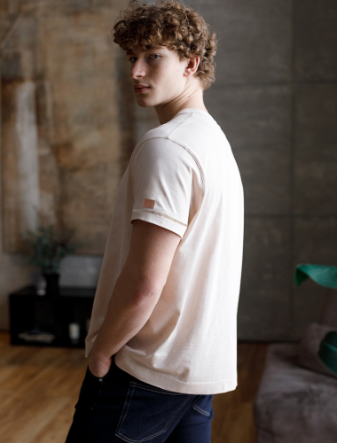 Футболка выполнена из фактурного полотна из 100% хлопка. Базовая однотонная модель, без труда впишется в любой гардероб. Ткань имеет характерный рисунок черточки за счет сочетания разных волокон хлопка 140-150 г. Хорошо держит форму и поддерживает комфортный микроклимат в течении дня. На рукаве нашивка из эко-кожи с логотипом бренда. терракотовый