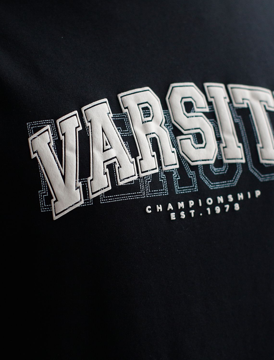 Перевод: "Школьная лига. Чемпионат 1978" надпись выполнена пуффом и красками с устойчивым покрытием. Футболка выполнена из премиального хлопка. Особым преимуществом является наличие эластана в составе изделия. Очень приятная на ощупь и комфортная при носке, футболка сохранит свой безупречный внешний вид в течении долгого времени. Модель дополнена нашивкой из эко-кожи с логотипом VILATTE. черный_varsity