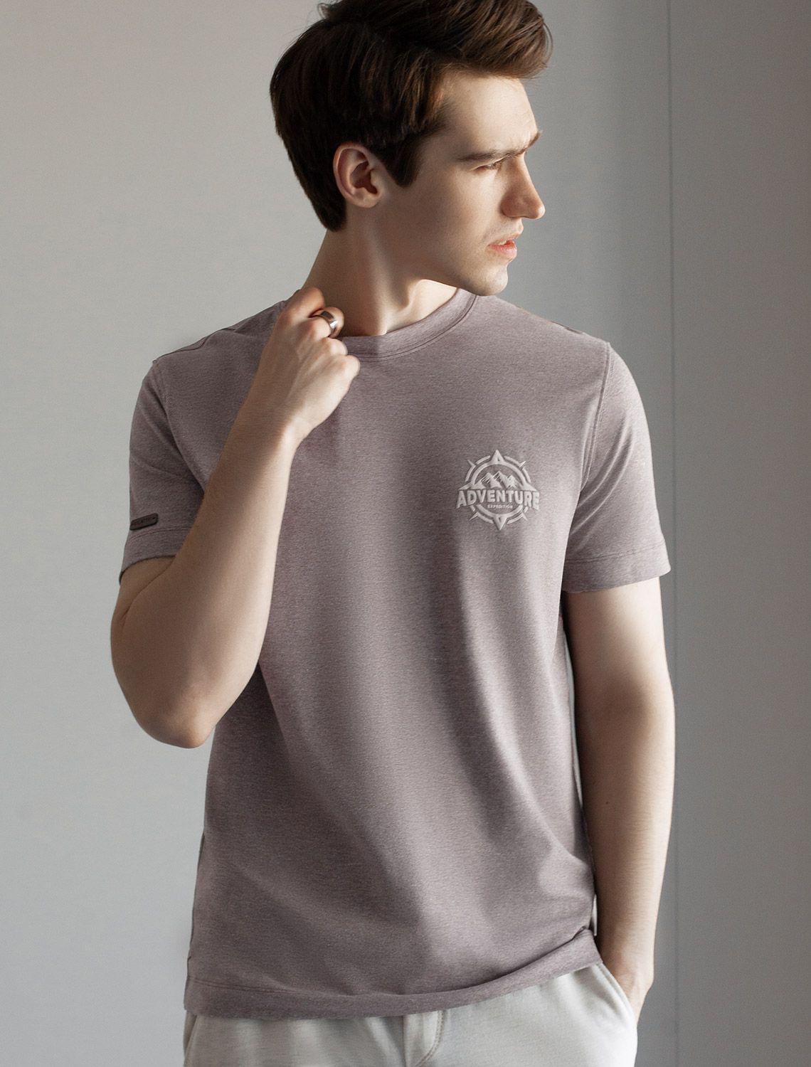 Перевод принта: Adventure - приключение. Футболка выполнена из премиального хлопка с эластаном. Авторский принт нанесен фактурными красками с устойчивым покрытием. Изделие комфортно сидит по фигуре, не сковывая движений. За счет среднего объема, хорошо подойдет как первый слой под пиджак, кардиган или бомбер. На рукаве нашивка из эко-кожи с логотипом бренда. т.кофейный меланж_adventure