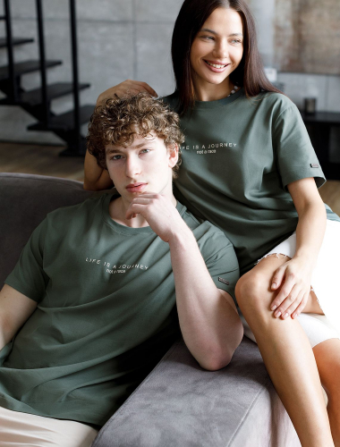 Ст.цена 1190р Футболка из премиального хлопка с авторским принтом U49.026 т.оливковый_journey