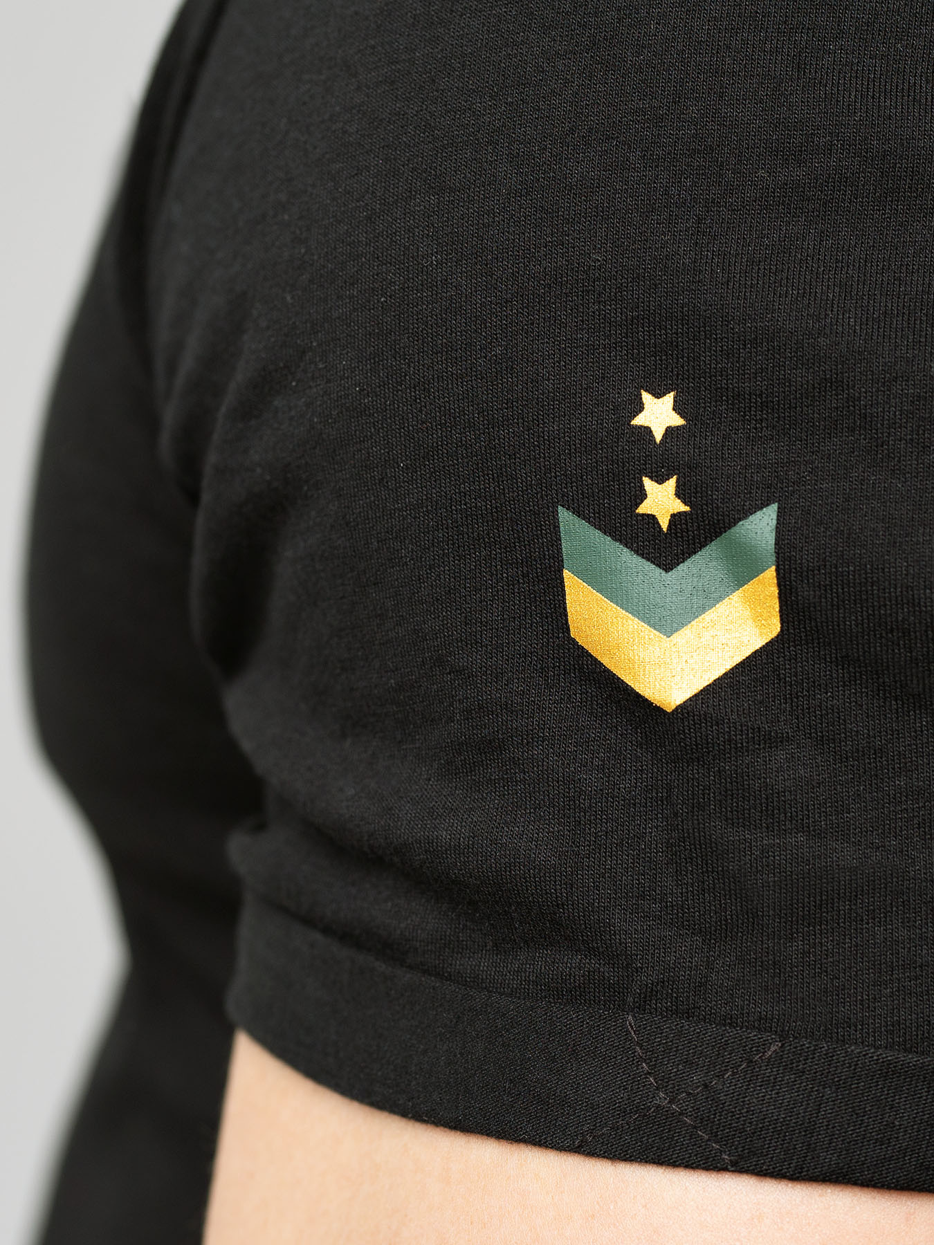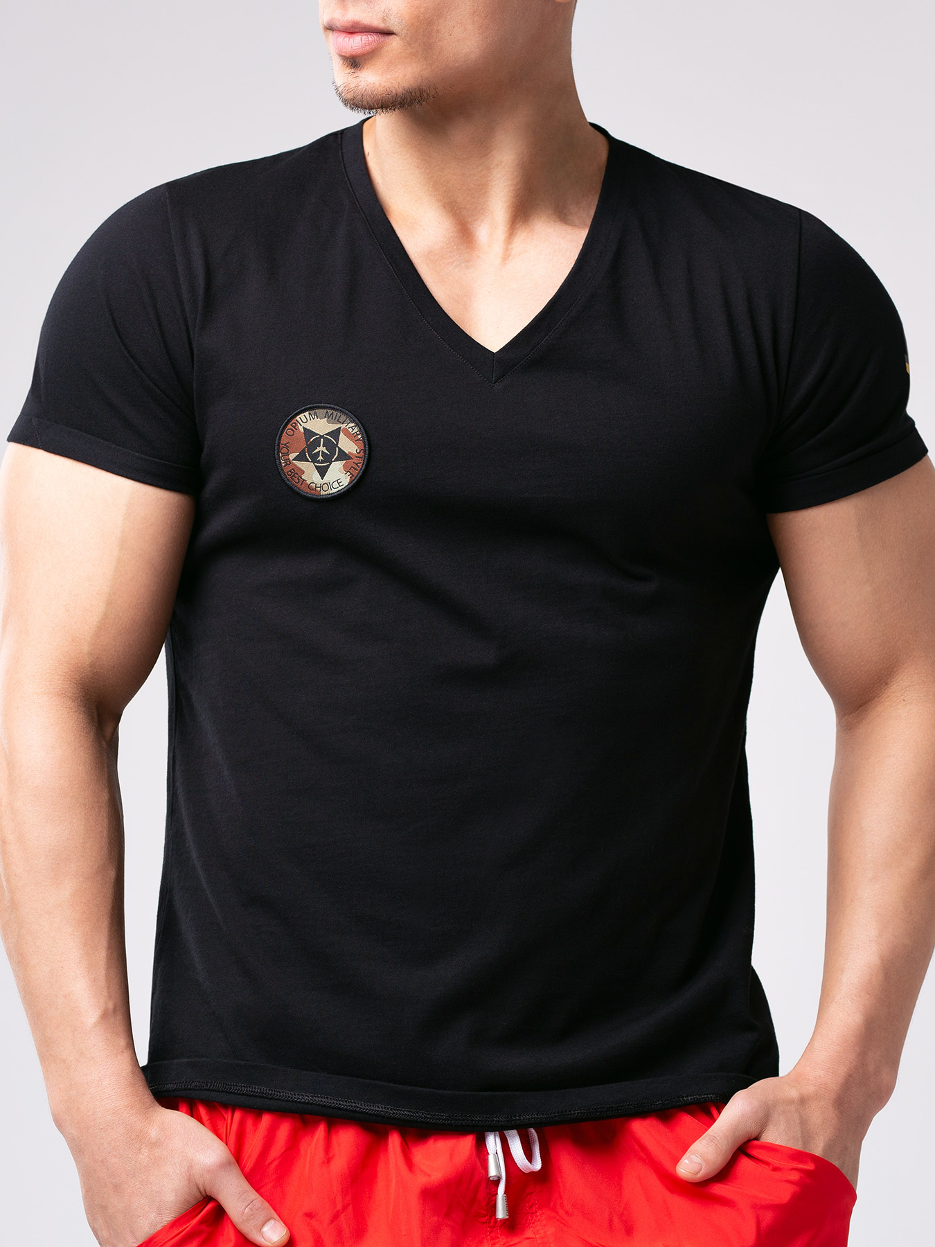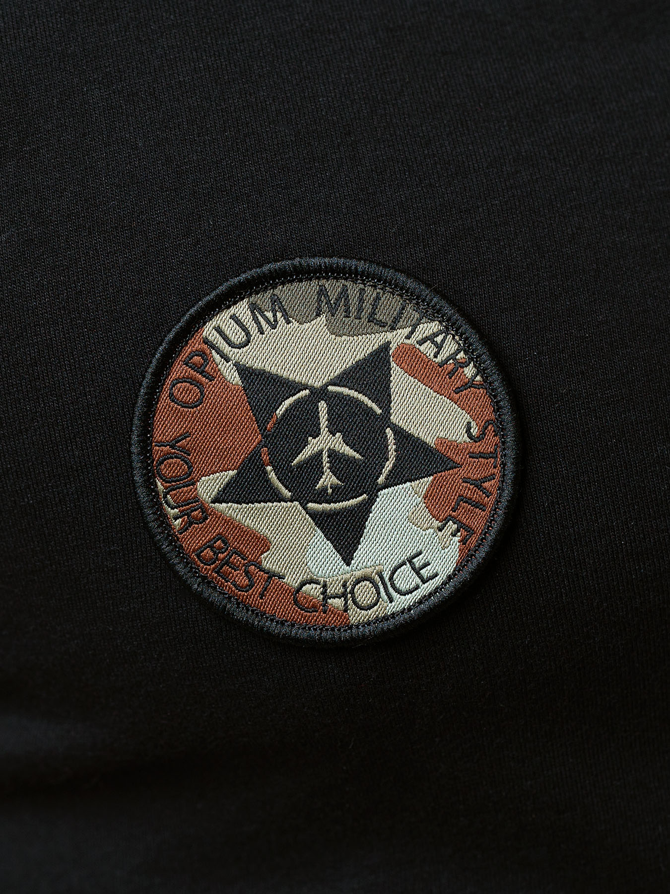 Шеврон на груди с камуфляжной символикой, принт на рукаве в виде военного знака различия. Модный силуэт, V-образный вырез горловины, рукава подвернуты наружу.