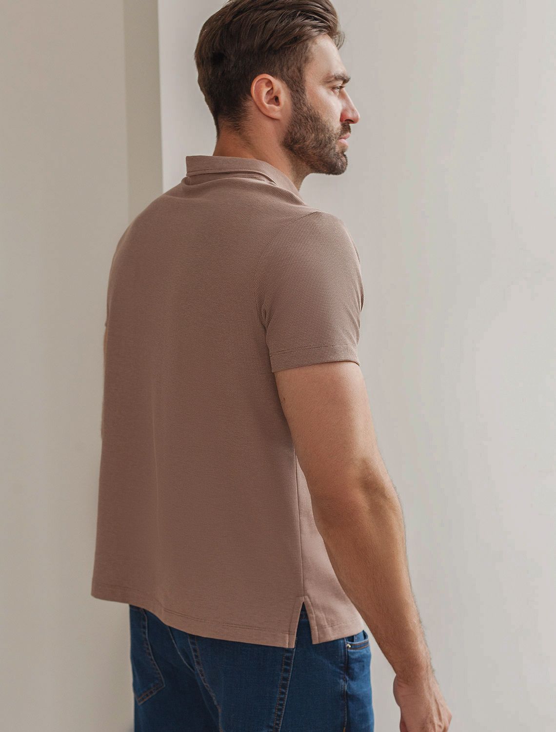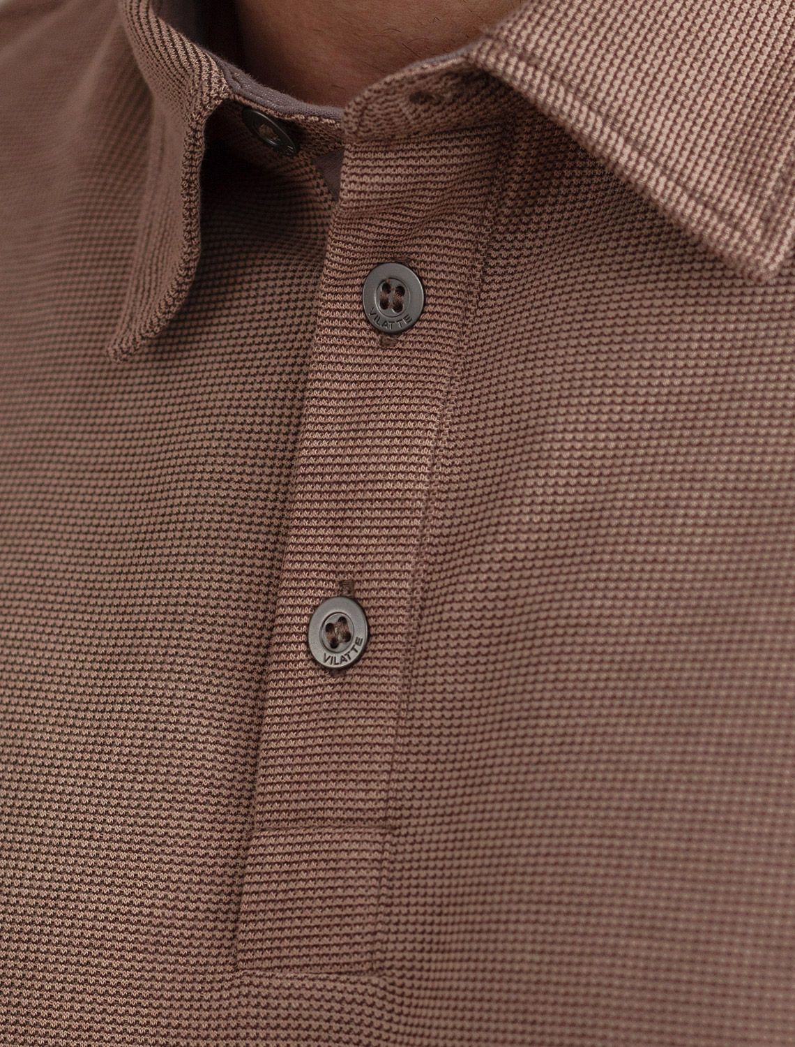 Футболка-поло выполнена из фактурного трикотажа. Однотонная модель с контрастной планкой и металлическими пуговицами с логотипом бренда. Эластичный хлопковый материал хорошо пропускает воздух и комфортно облегает фигуру. В таком изделии не будет жарко даже в самое теплое время года. коричневый