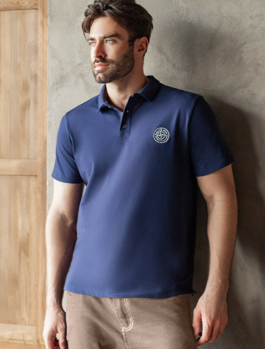 Футболка-поло выполнена из фактурного трикотажа. Модель с прямого кроя с небольшими разрезами по бокам дополнена вязаным воротником вышивкой с компасом. Премиальный хлопковый трикотаж гарантирует комфорт и износостойкость. На рукаве брендированная металлическая нашивка.