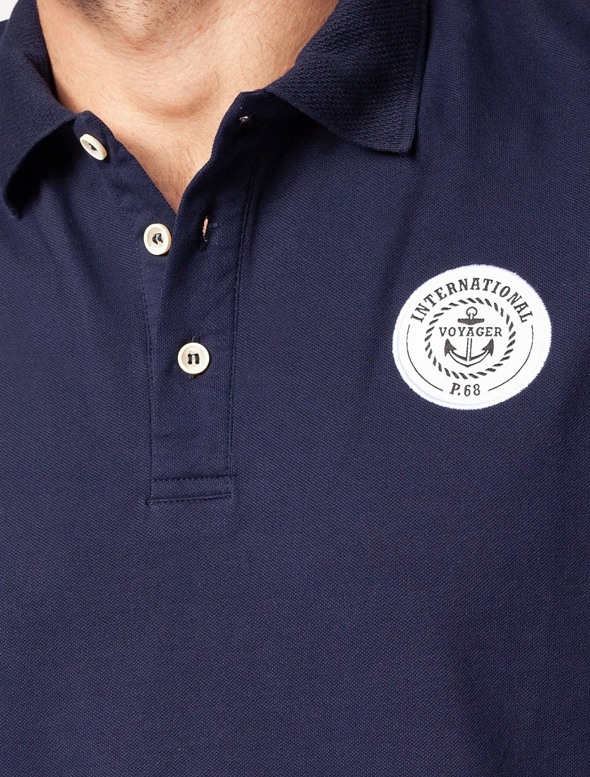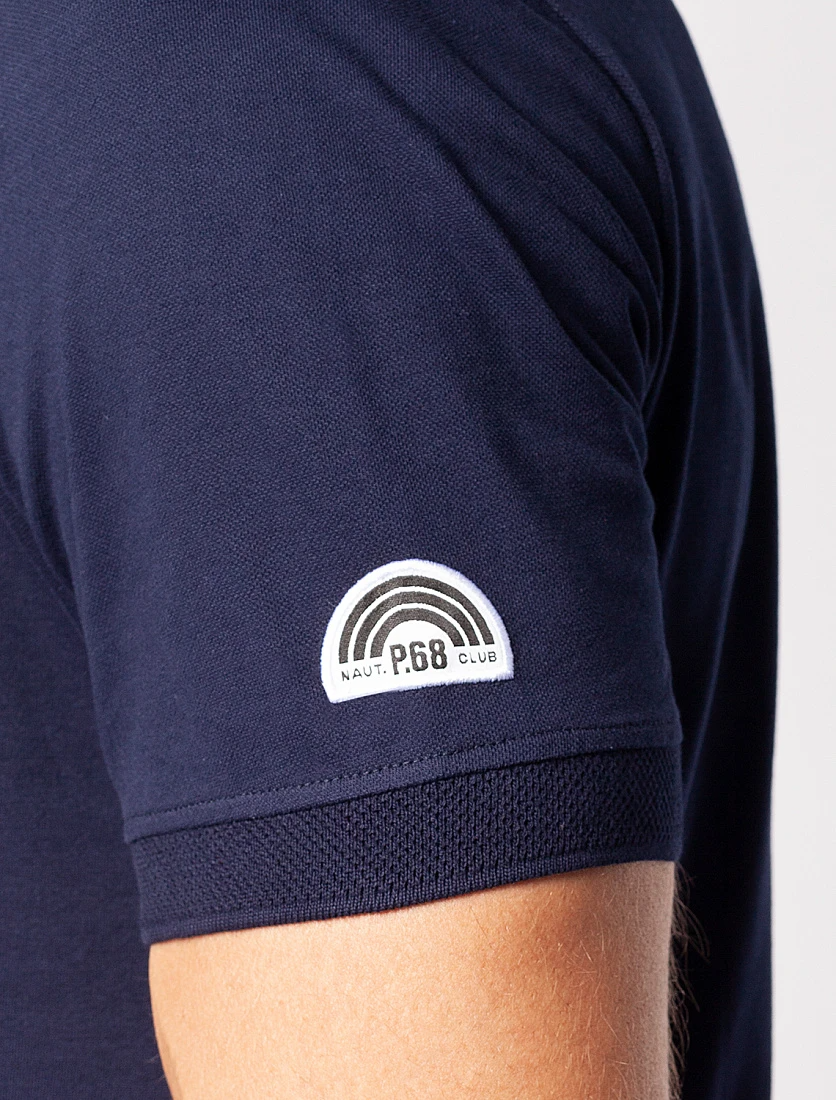Темно-синее прямое поло выполнено из премиального хлопка пике с характерной фактурой, которая обеспечивает эффективную циркуляцию воздуха. Наличие эластана в составе изделия способствует эластичности и меньшей сминаемости. Спереди – вышивка в морской тематике, внизу металлический логотип бренда. темно-синий