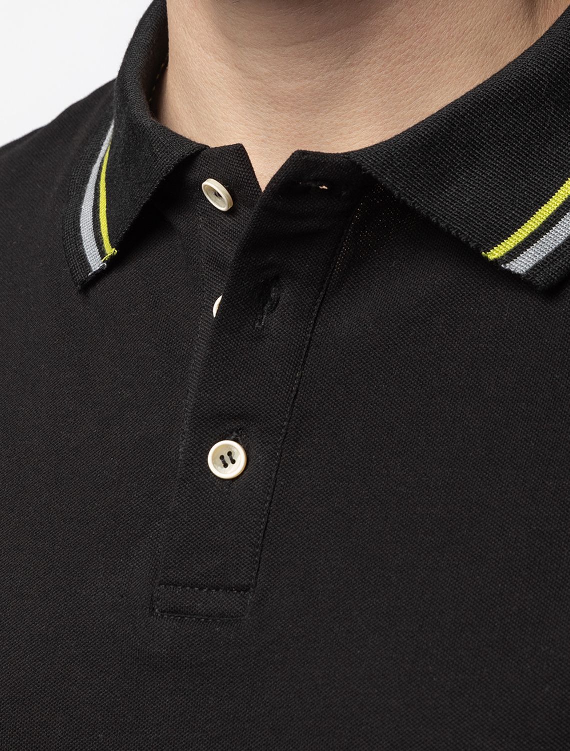 Черное прямое поло выполнено из премиального хлопка пике с характерной фактурой, которая обеспечивает эффективную циркуляцию воздуха. Деликатный акцент в модели выполнен в виде плетения контрастных полос на воротнике. Наличие эластана в составе изделия способствует эластичности и меньшей сминаемости. Внизу металлический логотип бренда.