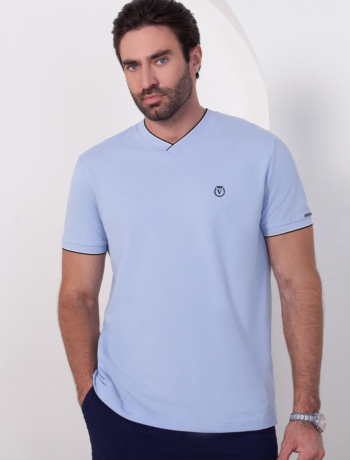 Футболка голубого цвета с аккуратным V-образным вырезом выполнена из премиального хлопка с эластаном плотностью 200 Г/м2. Высококачественный эластичный хлопок обеспечивает мягкость, воздухопроницаемость и идеальную посадку на любую фигуру и размеры, включая 58 размер. Классический прямой крой футболки подчеркивает фигуру, но не сковывает движений. Элегантный небольшой V-образный вырез с контрастной полосой визуально удлиняет шею, а минималистичная вышивка на груди в виде логотипа бренда добавляет изысканности и индивидуальности, не перегружая образ. Эта базовая футболка - идеальный баланс комфорта и стиля для современного мужчины, легко сочетается с разными низами, создавая образ от кэжуал до более элегантного. Стильная футболка подходит как для повседневной носки, так и для создания более нарядных образов.