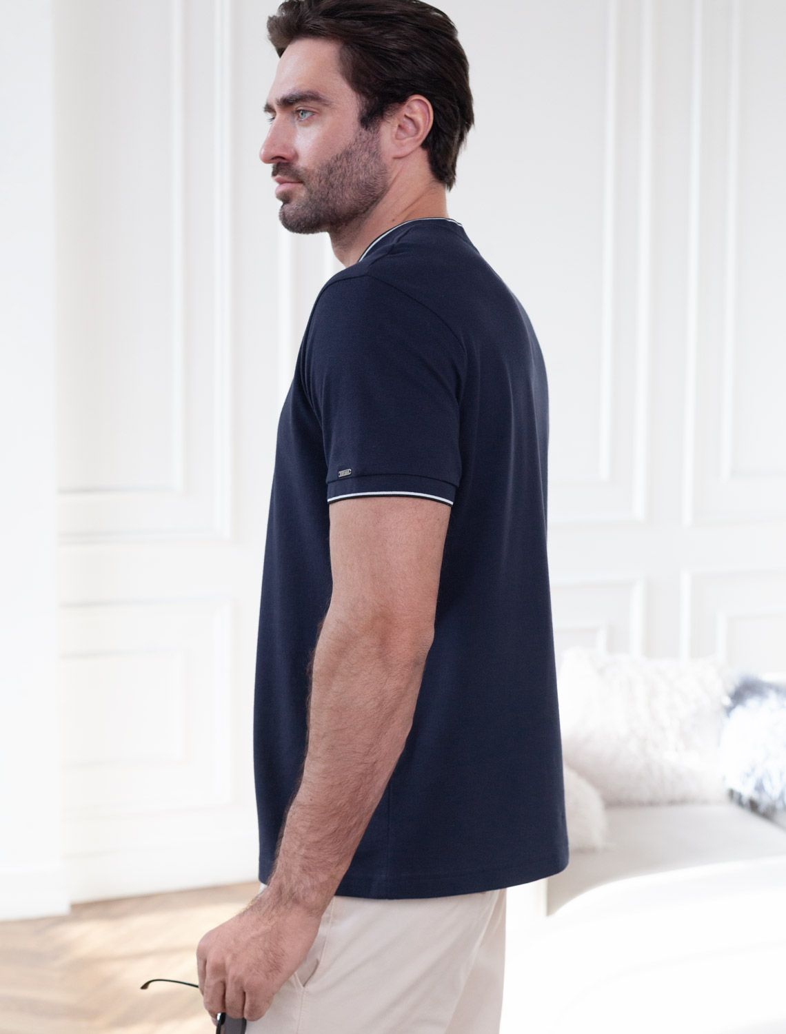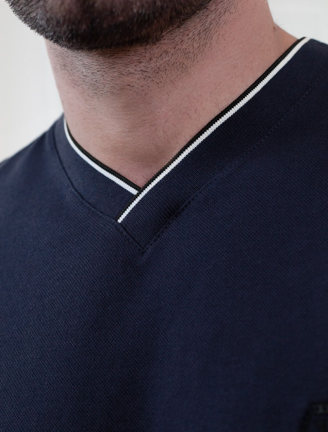 Футболка темно-синего цвета с аккуратным V-образным вырезом выполнена из премиального хлопка с эластаном плотностью 200 Г/м2. Высококачественный эластичный хлопок обеспечивает мягкость, воздухопроницаемость и идеальную посадку на любую фигуру и размеры, включая 58 размер. Классический прямой крой футболки подчеркивает фигуру, но не сковывает движений. Элегантный небольшой V-образный вырез с контрастной полосой визуально удлиняет шею, а минималистичная вышивка на груди в виде логотипа бренда добавляет изысканности и индивидуальности, не перегружая образ. Эта базовая футболка - идеальный баланс комфорта и стиля для современного мужчины, легко сочетается с разными низами, создавая образ от кэжуал до более элегантного. Стильная футболка подходит как для повседневной носки, так и для создания более нарядных образов.