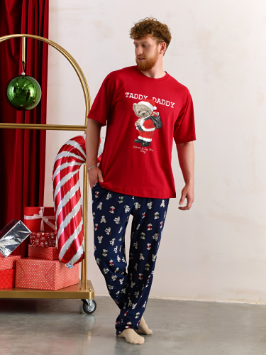 Костюм мужской из трикотажного полотна "кулирка" в комбинации двух видов: гладкокрашенного и с рисунком в крупную клетку, сочетающихся между собой по цвету, состоящий из джемпера и брюк. Джемпер - из гладкокрашеного полотна, свободного покроя, с длинными втачными рукавами и приспущенными плечами, с горловиной овальной формы и тематическим принтом, выполненным в технике шелкографии. Горловина, нижние срезы рукавов и низ изделия обработаны подгибкой с отделочным широким кантом контрастного цвета. Брюки - из полотна в клетку, свободного покроя, прямые, на притачном поясе с эластичной тесьмой внутри, с карманами в боковых швах. Нижние срезы обработаны подгибкой.