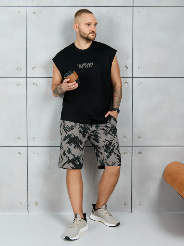 Костюм для мальчика, состоящий из футболки и брюк. Футболка однотонная с принтом на груди; модель свободная, со спущенной линией плеч, овальным вырезом горловины. Брюки из полотна с набивным рисунком эксклюзивного дизайна, прямые, с боковыми карманами с обтачными входами, на притачном поясе с отстроченной эластичной тесьмой.