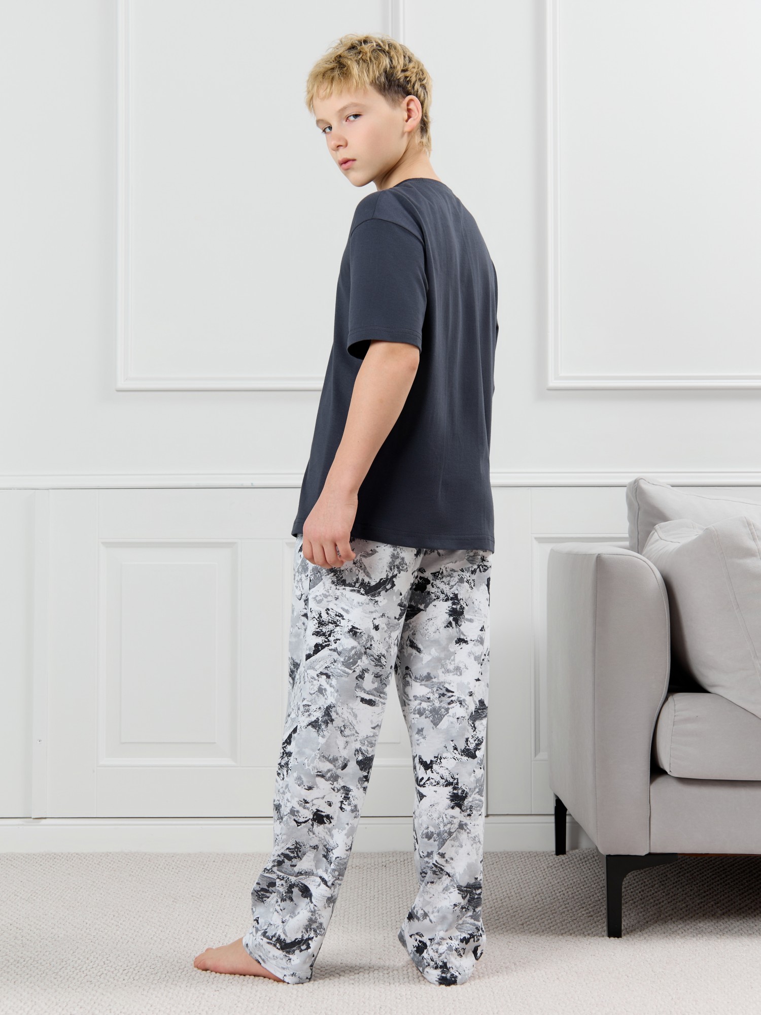 Костюм для мальчика, состоящий из футболки и брюк. Футболка однотонная с принтом на груди; модель свободная, со спущенной линией плеч, овальным вырезом горловины. Брюки из полотна с набивным рисунком эксклюзивного дизайна, прямые, с боковыми карманами с обтачными входами, на притачном поясе с отстроченной эластичной тесьмой.