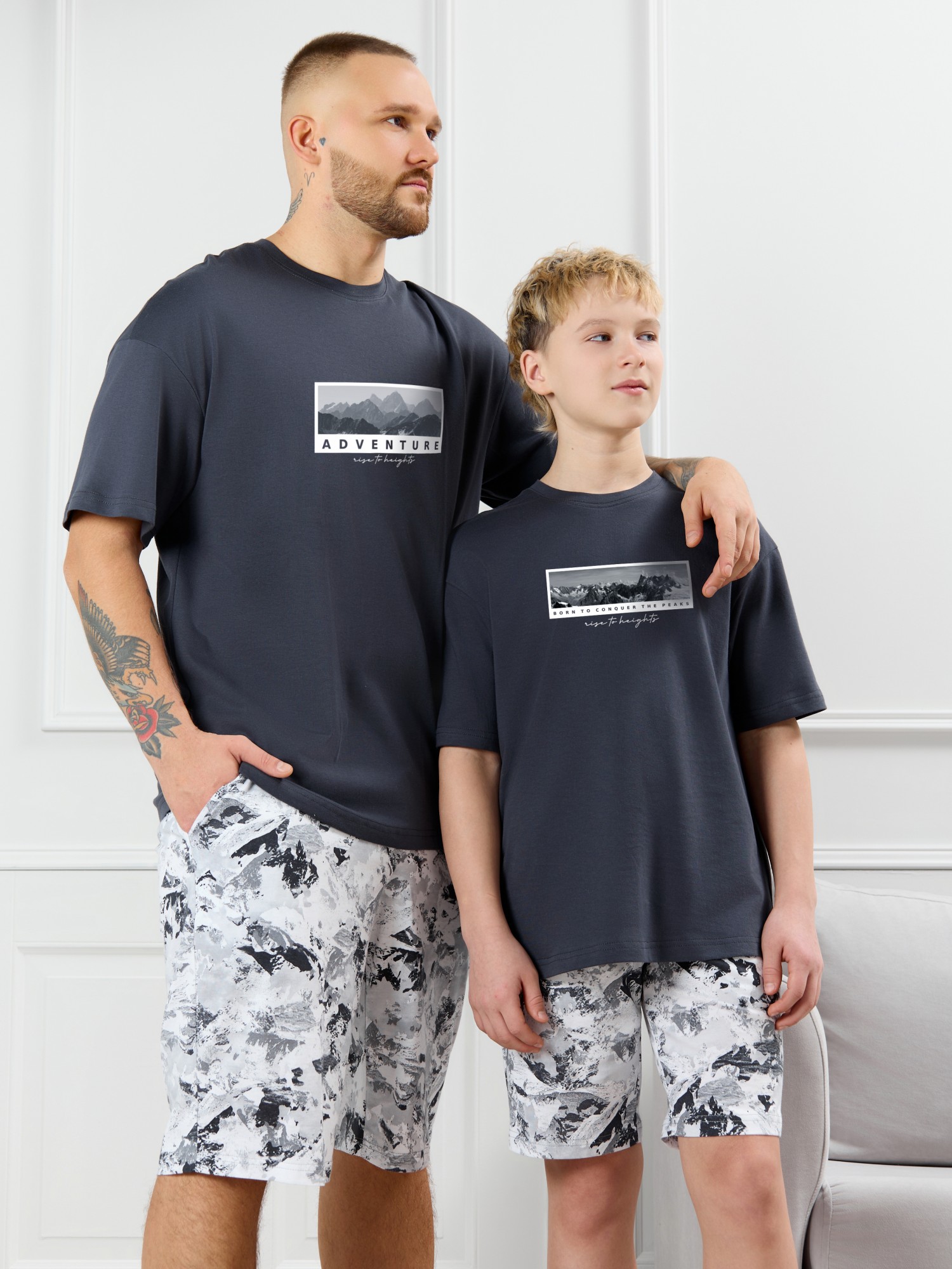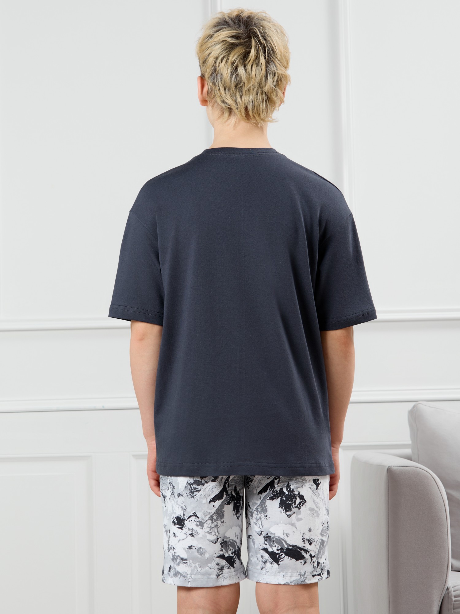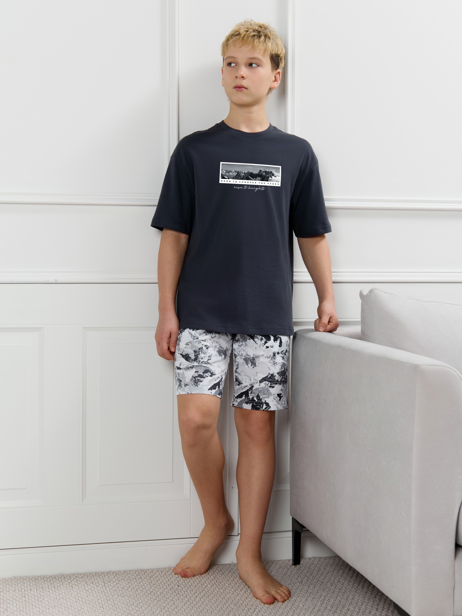 Костюм для мальчика, состоящий из футболки и шорт. Футболка однотонная с принтом на груди; модель свободная, со спущенной линией плеч, овальным вырезом горловины. Шорты из полотна с набивным рисунком эксклюзивного дизайна, с боковыми карманами с обтачными входами, на притачном поясе с отстроченной эластичной тесьмой.