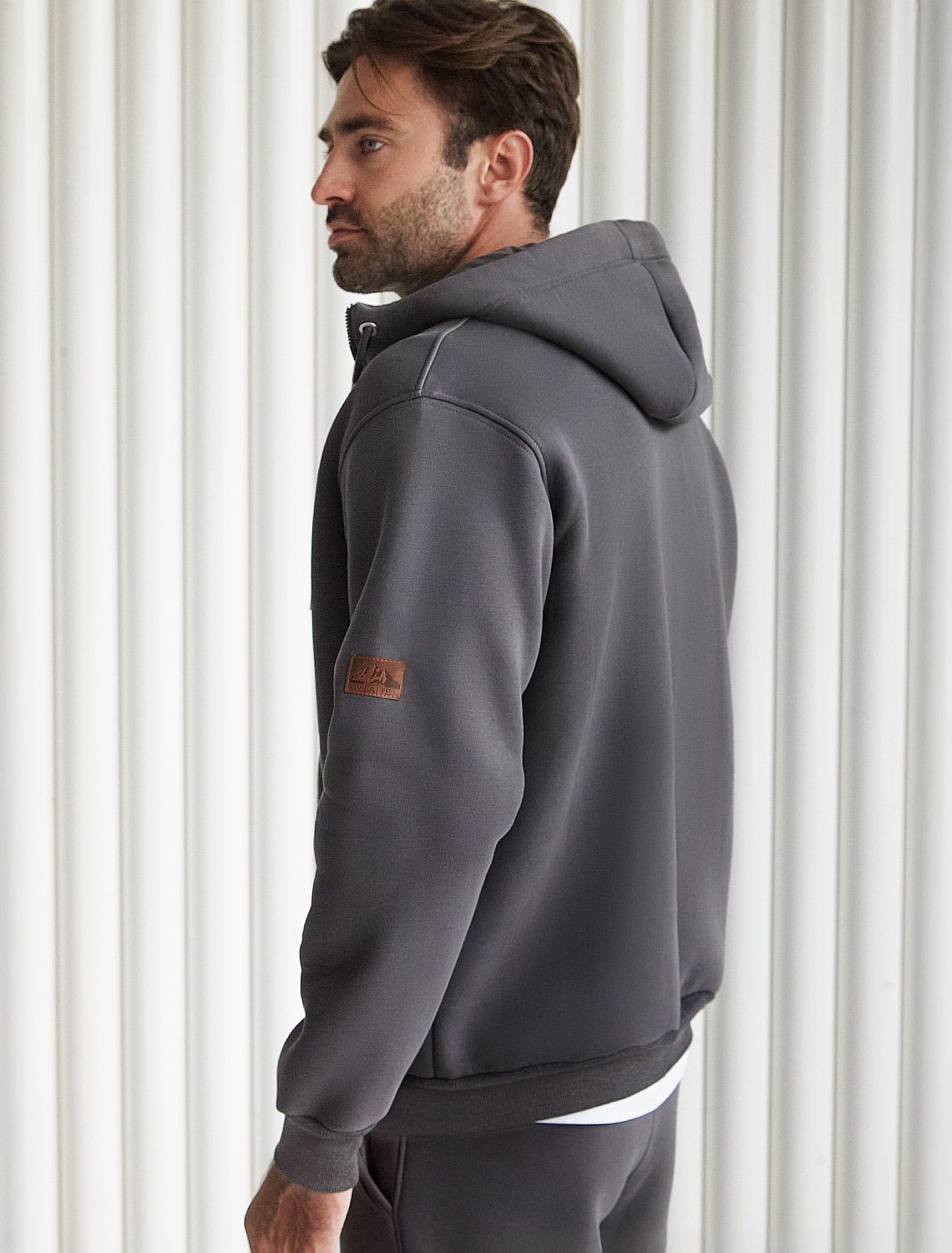 Худи на молнии выполнено из премиального эластичного футера трехнитки с теплым начесом. Модель с капюшоном и воротом стойка дополнена боковыми карманами и нашивкой с логотипом бренда из эко-кожи. Ранней осенью или поздней весной можно носить в качестве верхней одежды. Высококачественная фурнитура цвета темное серебро. Изделие сочетается в костюме с брюками U44.006
