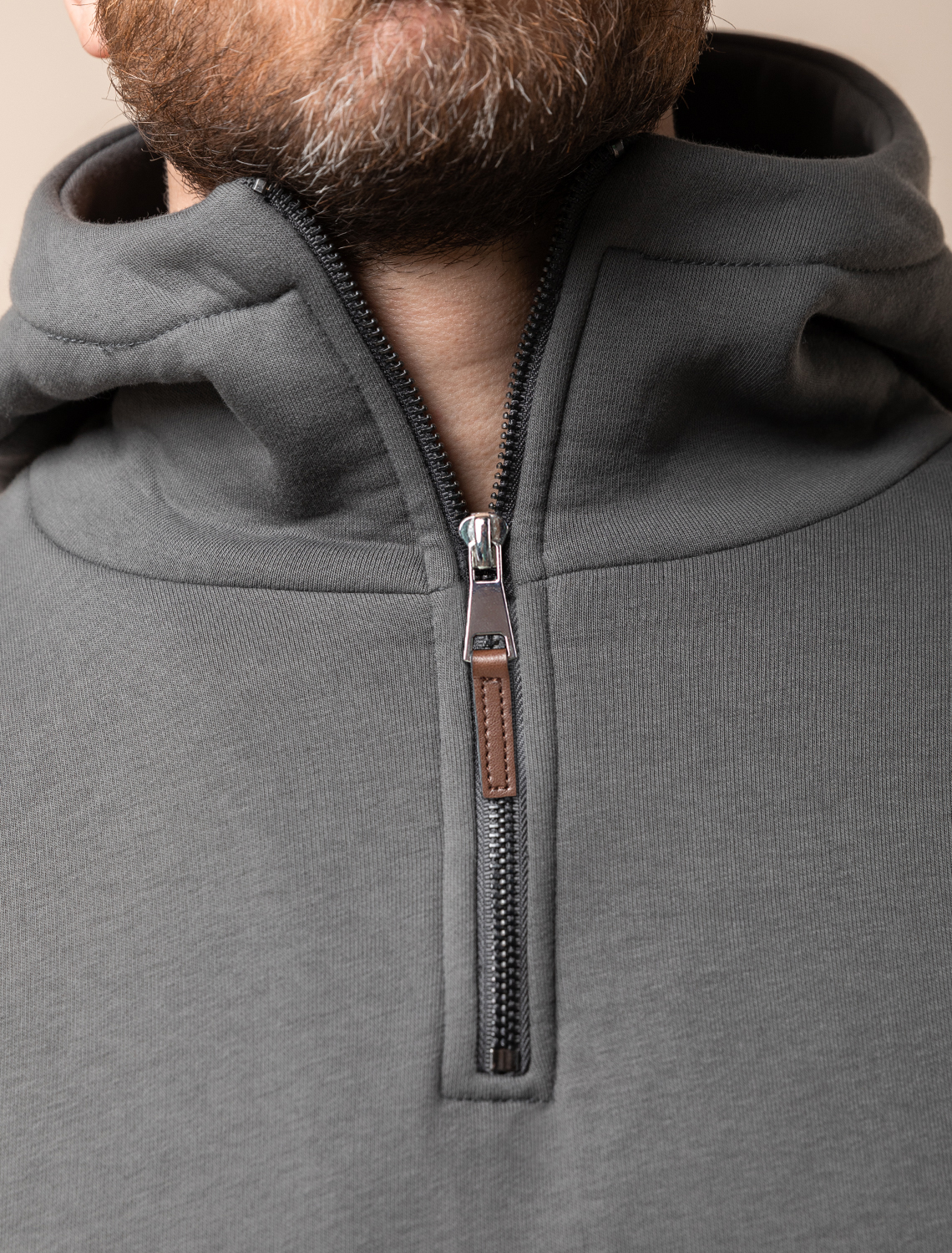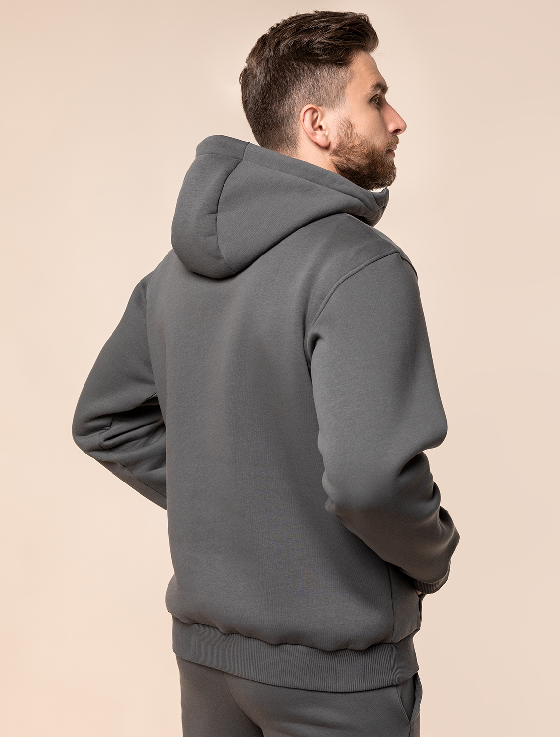 Худи выполнено из премиального футера-трехнитки с начесом. Теплая модель дополнена удобным карманом кенгуру и темно-серебристой молнией на вороте. Благодаря регулировке воротника можно носить изделие по-разному, как джемпер и как худи. Сочетайте в костюме с брюками U44.002 серый