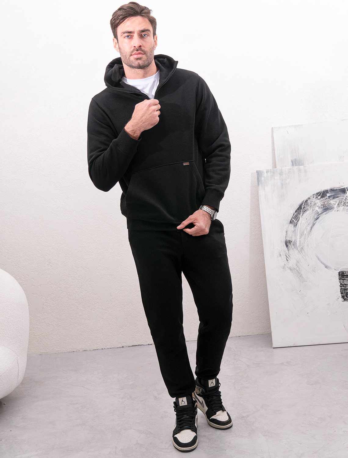 Худи выполнено из премиального футера-трехнитки с начесом. Теплая модель дополнена удобным карманом кенгуру и темно-серебристой молнией на вороте. Благодаря регулировке воротника можно носить изделие по-разному, как джемпер и как худи. Сочетайте в костюме с брюками U44.002 черный