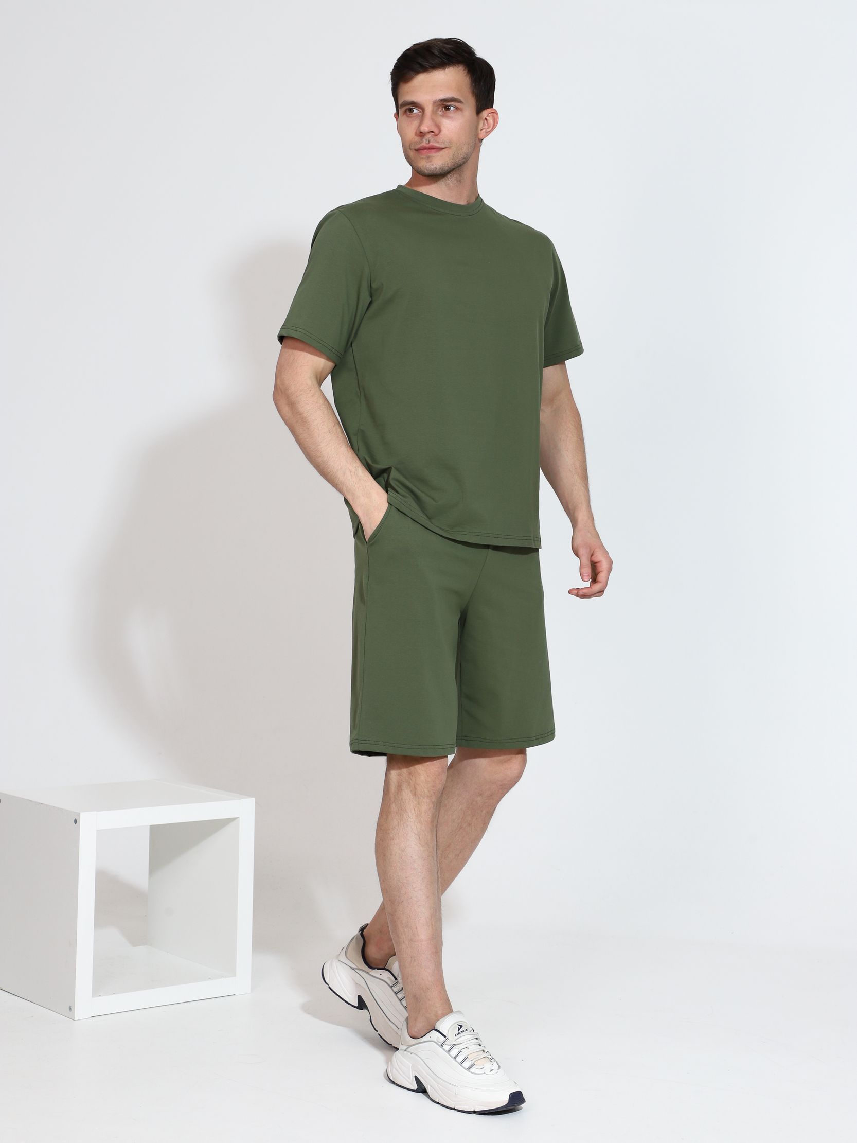 Мужской костюм состоит из футболки и шорт. Футболка свободного кроя с круглым вырезом горловины. Шорты - бермуды свободного кроя, с боковыми карманами