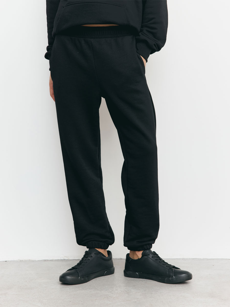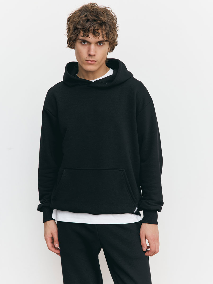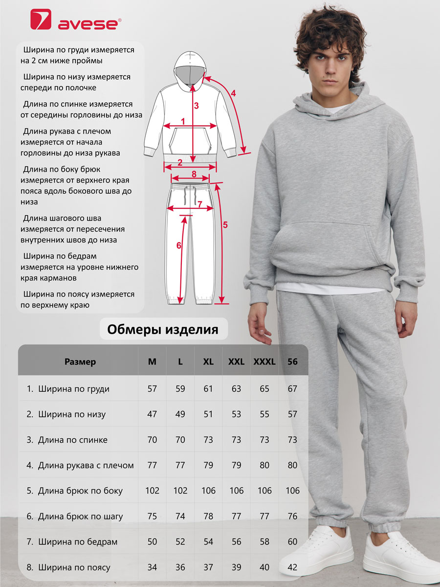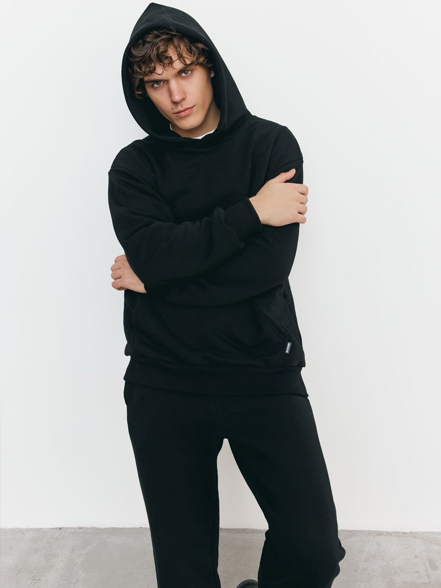 Мужской костюм из футера 3-х нитка петля: толстовка + джоггеры. В толстовке плечо спущено, рукав рубашечный. Спереди накладной карман-кенгуру. Капюшон втачной, с внутренним капюшоном из кулирки. Манжеты и пояс из кашкорсе в цвет футера. Джоггеры с отрезным поясом, строчёным с резинкой и цельнокроеными манжетами с эластичной тесьмой. На передних половинках брюк два кармана в боковых швах. В пояс брюк вставлен шнурок. Подкладка: 95% хлопок/ 5% эластан