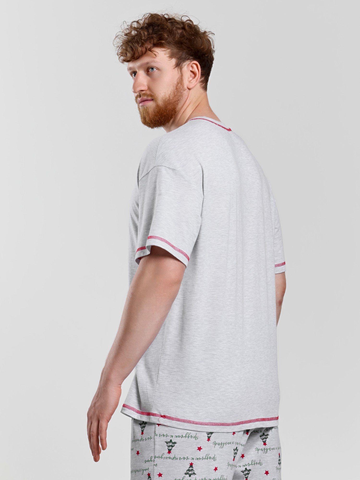 Костюм мужской из трикотажного полотна в комбинации двух видов: полотна "кулирка-кармеланж" и полотна "кулирка"с набивным тематическим рисунком на сером фоне , состоящий из футболки и брюк. Футболка - классического силуэта, свободного покроя, с приспущенным плечом, с втачными рукавами длиной до локтя, горловиной овальной формы, обработанной втачной планкой и принтом в центре переда. По шву втачивания планки настрочена декоративная (5-ниточная) отделочная строчка нитками контрастного цвета Подгибка низа рукавов и изделия так же выполнена с применением декоративной отделочной строчки. Брюки выполнены из полотна с набивным тематическим рисунком, длинные, умеренной ширины, прямые, на притачном поясе с эластичной тесьмй внутри и карманами в боковых швах.