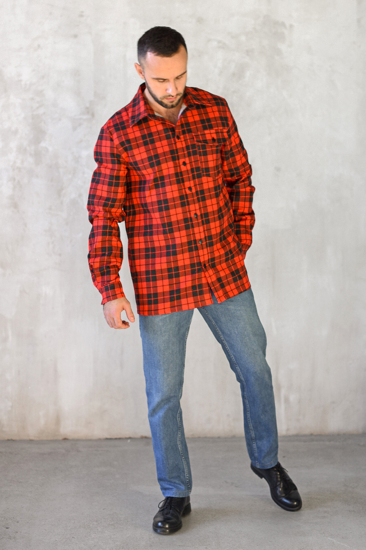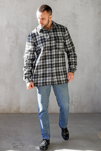 Мужская классическая сорочка из 100% хлопчатобумажной ткани – фланель, с длинными рукавами и застёжкой на петли - пуговицы. На полочке с левой стороны нагрудный накладной карман с клапаном. Рукава на манжетах. Воротник отложной с отрезной стойкой. Сорочка может быть использована как комфортная одежда для дома, так и в качестве повседневной одежды. Создать красивый стильный комплект можно дополнив сорочку трикотажной футболкой.
