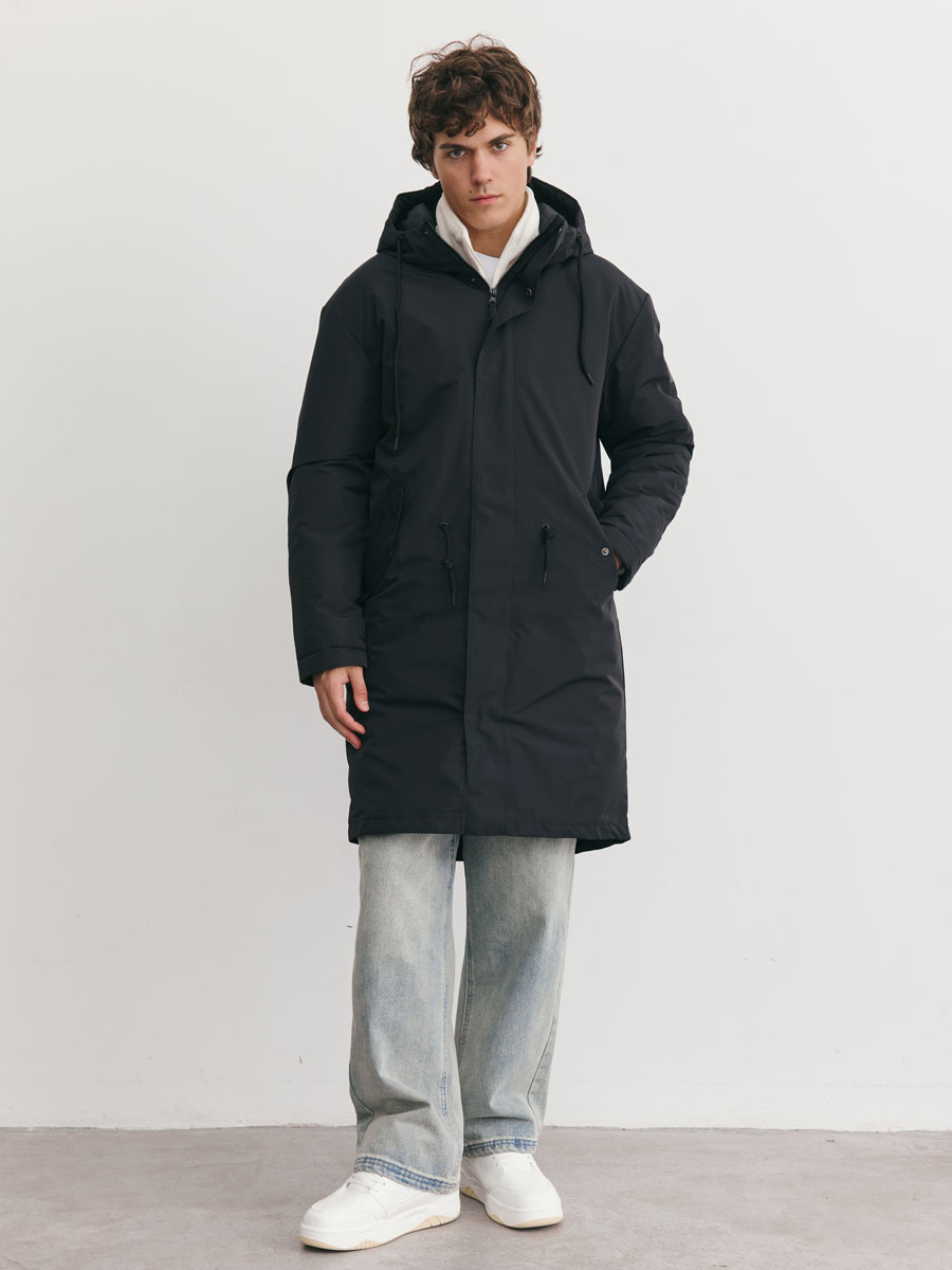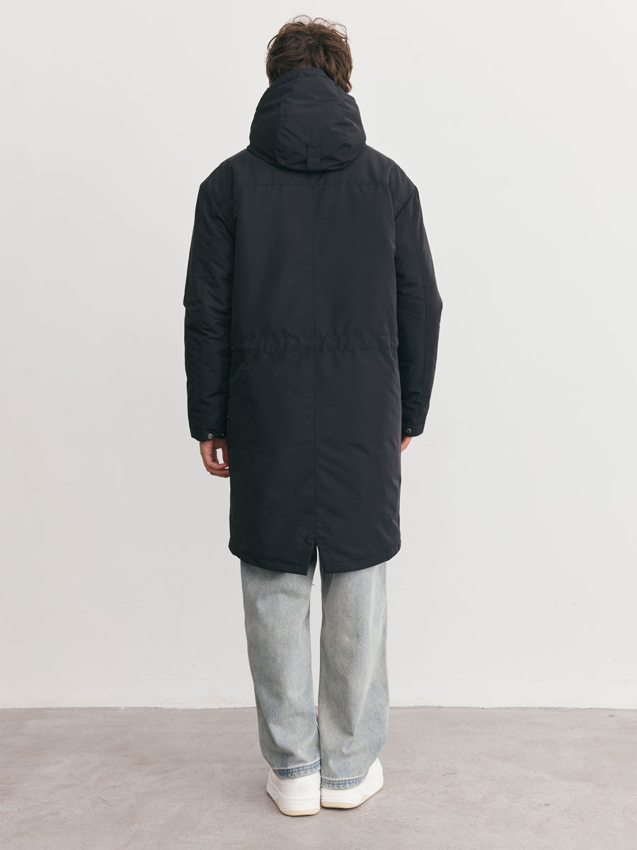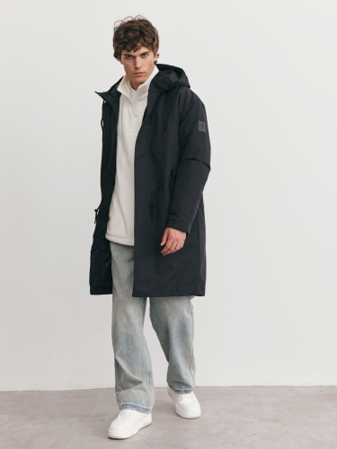 Демисезонная удлиненная куртка для мужчин, прямого силуэта, с втачным капюшоном. Центральная застёжка на молнию, закрытую планкой на потайных кнопках. В плаще по талии кулиса со шнуром. Концы шнура снаружи. На полочках 2 прорезных кармана с листочками, закрыты клапанами на кнопках. Низ куртки фигурный, с разрезом на спинке. . По низу рукава кнопки для регулировки ширины внизу. На капюшоне хлястик и липучка для регулировки глубины. По лицевому краю капюшона кулиса с люверсами и шнуром, выведенным наружу. Подкладка настегана на утеплитель. На левой подкладочной полочке – прорезной карман «в рамку» с молнией. Рассчитана на температуру от 0 до +15. Утеплитель: 100% полиэстер Подкладка: 100% полиэстер