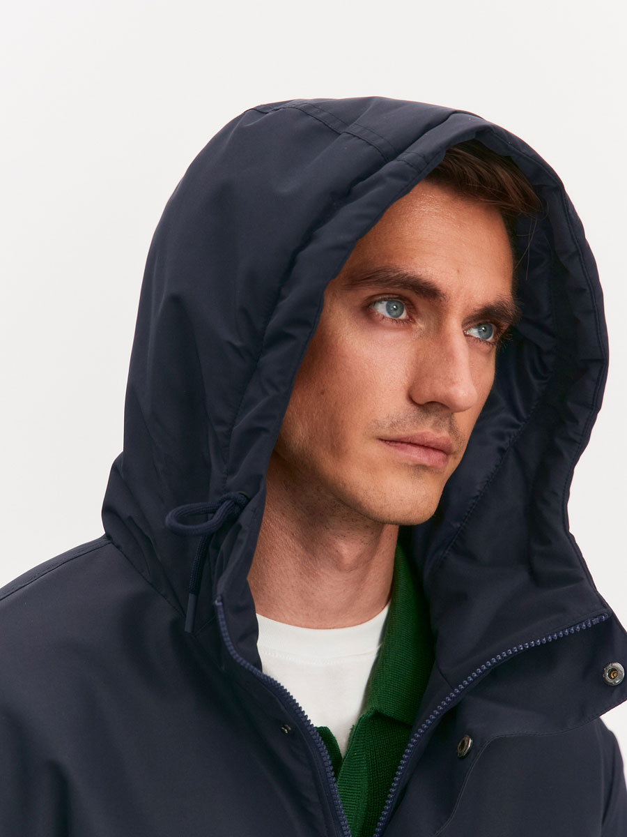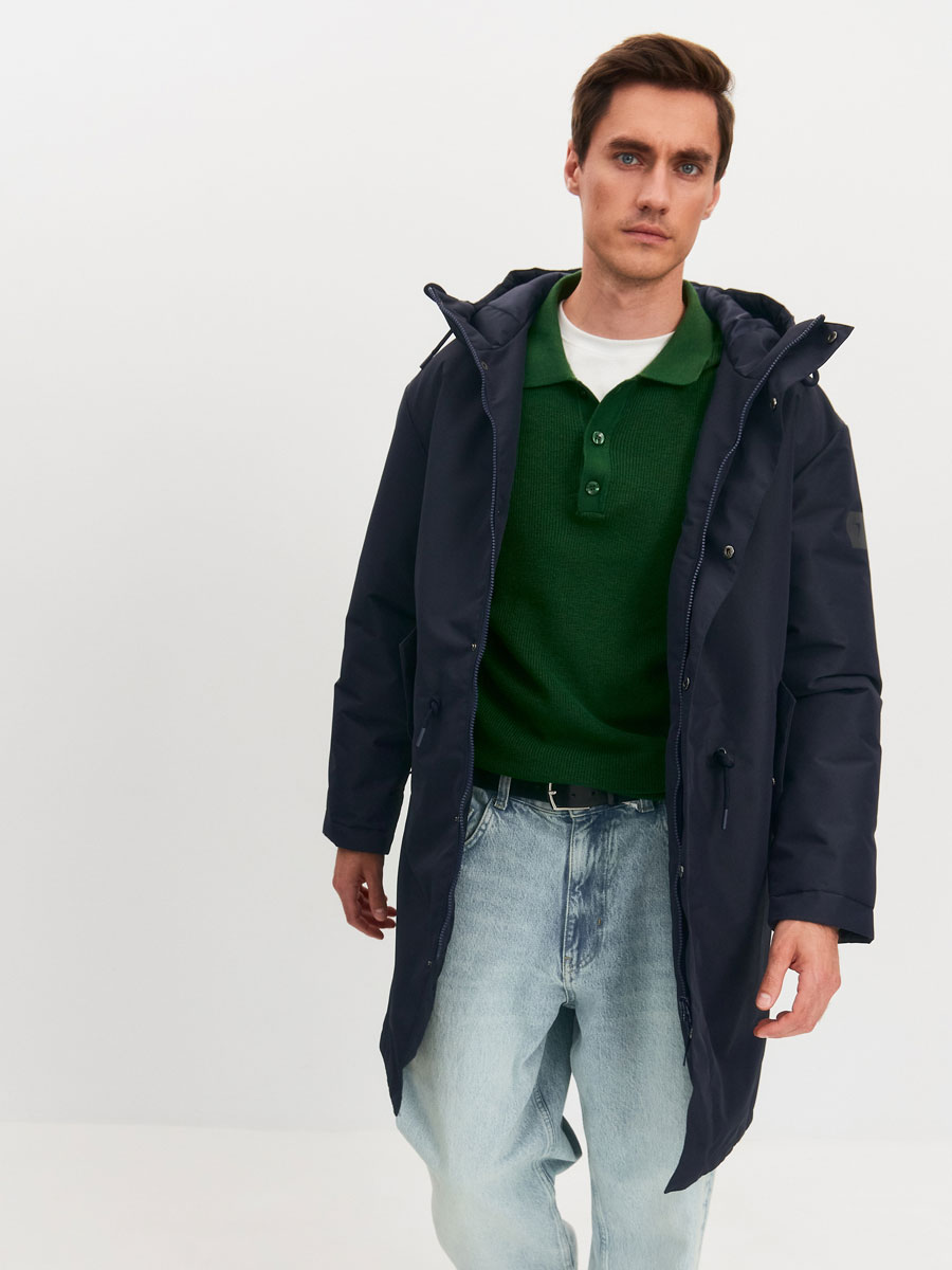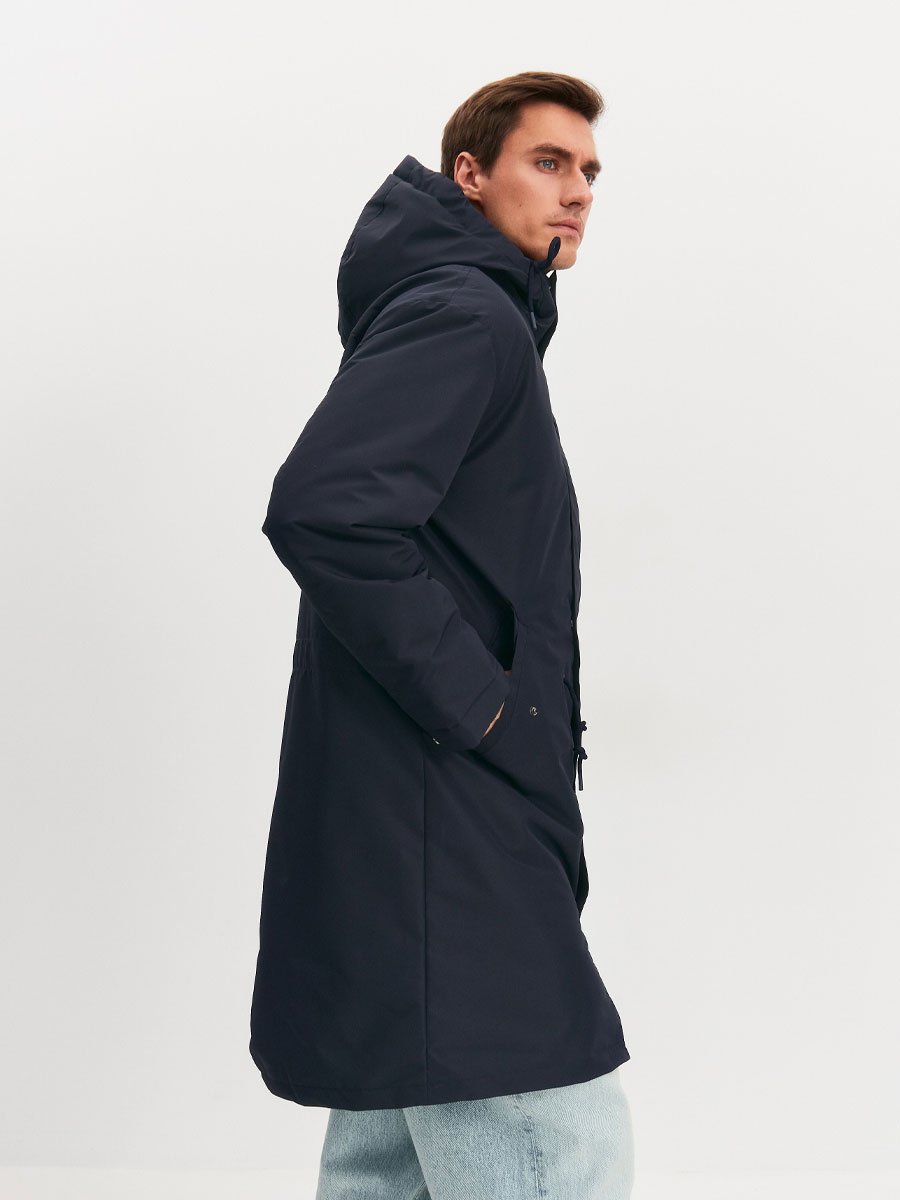 Демисезонная удлиненная куртка для мужчин, прямого силуэта, с втачным капюшоном. Центральная застёжка на молнию, закрытую планкой на потайных кнопках. В плаще по талии кулиса со шнуром. Концы шнура снаружи. На полочках 2 прорезных кармана с листочками, закрыты клапанами на кнопках. Низ куртки фигурный, с разрезом на спинке. . По низу рукава кнопки для регулировки ширины внизу. На капюшоне хлястик и липучка для регулировки глубины. По лицевому краю капюшона кулиса с люверсами и шнуром, выведенным наружу. Подкладка настегана на утеплитель. На левой подкладочной полочке – прорезной карман «в рамку» с молнией. Рассчитана на температуру от 0 до +15.