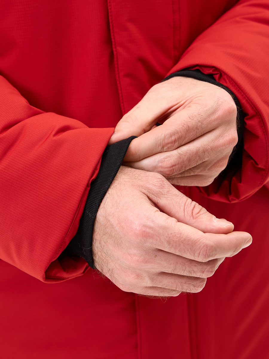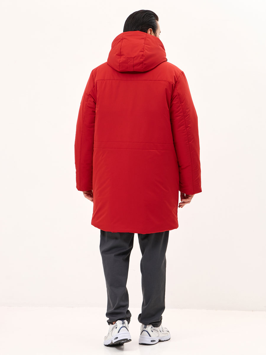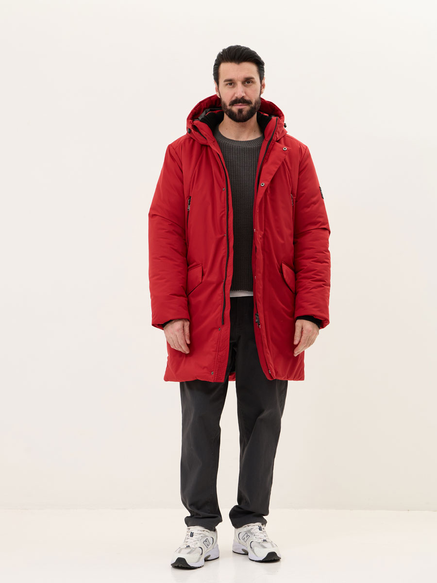 Зимняя удлиненная куртка для мужчин, прямого силуэта, с втачным капюшоном и внутренним воротником из трикотажа. Центральная застёжка на молнию, закрытую планкой на потайных кнопках.  2 нижних кармана с клапаном на кнопке, 2 верхних кармана с молниями. 1 внутренний карман с молнией. По лицевому краю капюшона кулиса с люверсами и резиновым шнуром с фиксаторами для регулировки. На центральной части капюшона хлястик и липучка для регулировки. Низ рукава прямой, с внутренним манжетом из трикотажа.