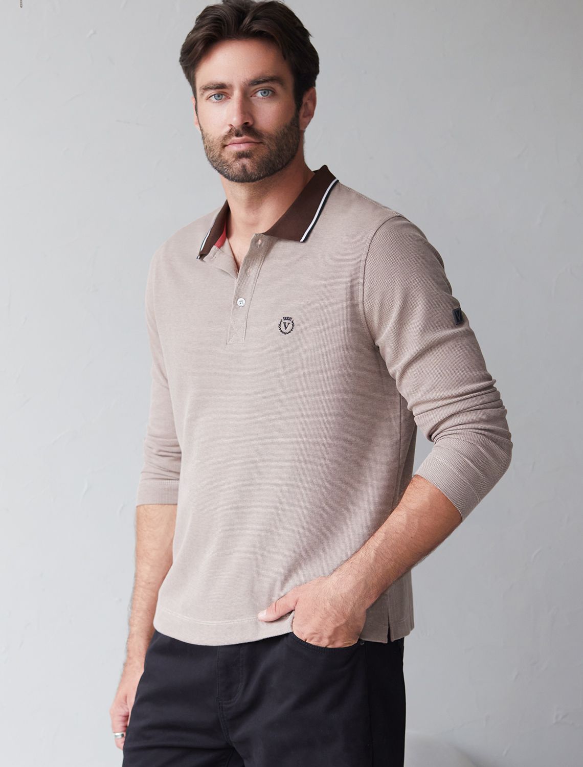 Стильный лонгслив коричневого цвета с плетеным воротником поло с застежкой на пуговицы выполнен из премиального хлопка в сочетании с эластаном .Невероятно мягкая ткань из натуральных волокон - она едва ощутима на коже и словно обнимает тело. Материал при касании кажется бархатистым, при движении он словно повторяет все мельчайшие линии фигуры. По свойствам материал сочетает в себе практичность и нежность: отлично провускает воздух, сохраняя ощущение свежести в течение всего дня, при этом созраняет тепло в прохладную погоду.Идеально подходит для чувствительной кожи, не вызывает раздражения и дискомфорта. Удобный отложной воротник делает образ современным и стильным, а длинные рукава с манжетами защищают руки при ветреной погоде.