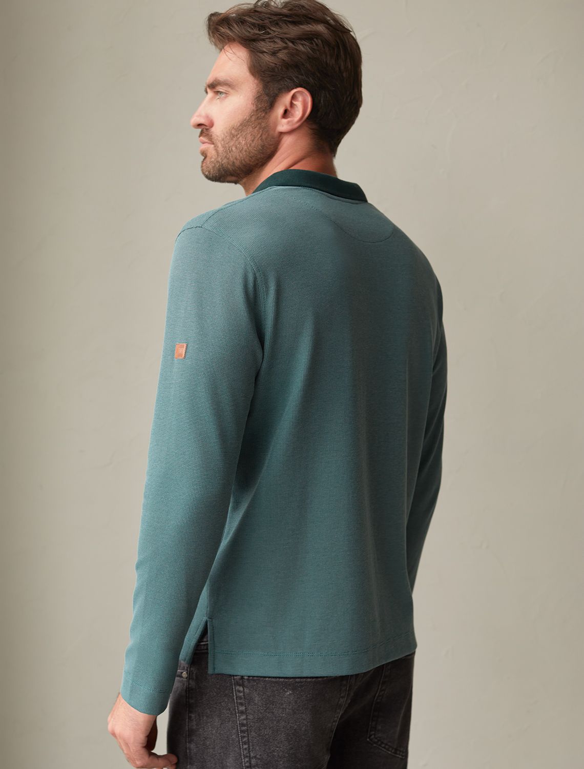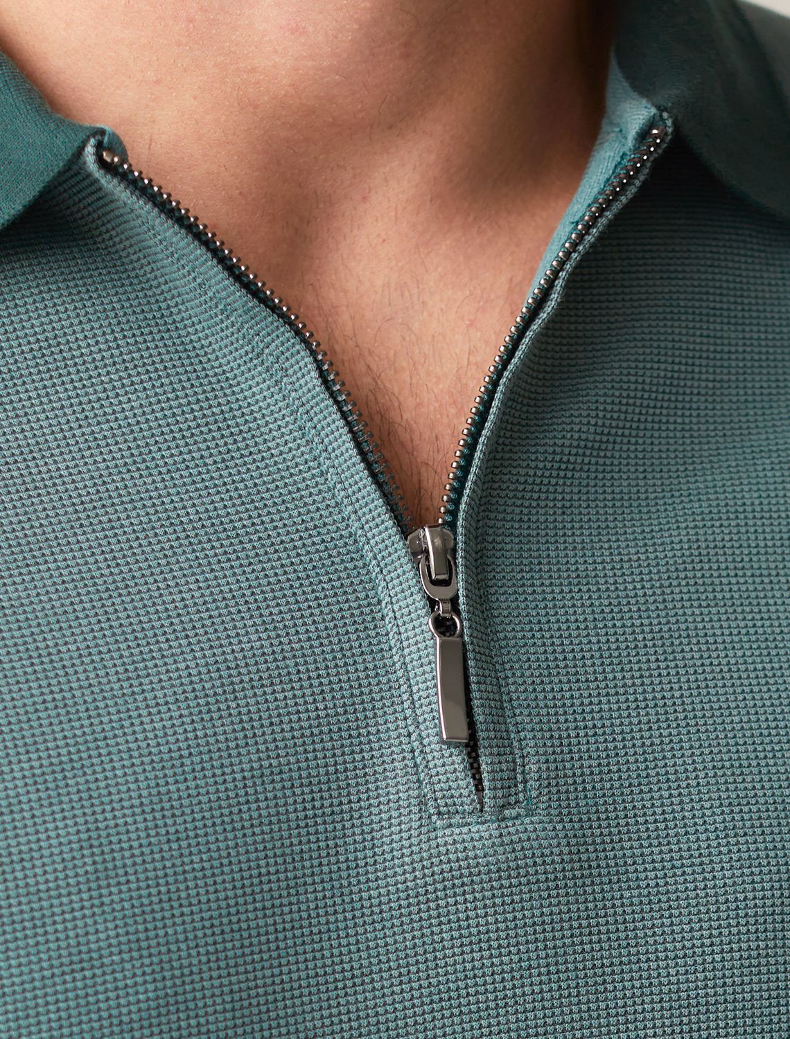 Стильный лонгслив дымчато-изумрудного цвета с плетеным воротником поло с застежкой на молнию выполнен из премиального хлопка в сочетании с эластаном .Невероятно мягкая ткань из натуральных волокон - она едва ощутима на коже и словно обнимает тело. Материал при касании кажется бархатистым, при движении он словно повторяет все мельчайшие линии фигуры. По свойствам материал сочетает в себе практичность и нежность: отлично провускает воздух, сохраняя ощущение свежести в течение всего дня, при этом созраняет тепло в прохладную погоду.Идеально подходит для чувствительной кожи, не вызывает раздражения и дискомфорта. Удобный отложной воротник делает образ современным и стильным, а длинные рукава с манжетами защищают руки при ветреной погоде.