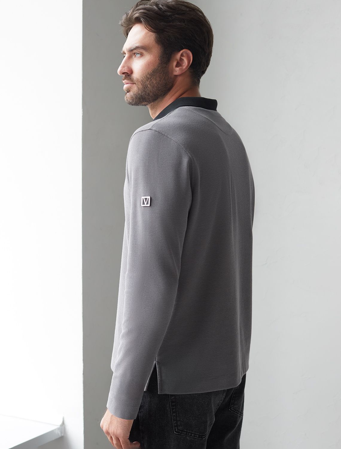 Стильный лонгслив темно-серого цвета с плетеным воротником поло с застежкой на молнию выполнен из премиального хлопка в сочетании с эластаном .Невероятно мягкая ткань из натуральных волокон - она едва ощутима на коже и словно обнимает тело. Материал при касании кажется бархатистым, при движении он словно повторяет все мельчайшие линии фигуры. По свойствам материал сочетает в себе практичность и нежность: отлично провускает воздух, сохраняя ощущение свежести в течение всего дня, при этом созраняет тепло в прохладную погоду.Идеально подходит для чувствительной кожи, не вызывает раздражения и дискомфорта. Удобный отложной воротник делает образ современным и стильным, а длинные рукава с манжетами защищают руки при ветреной погоде.