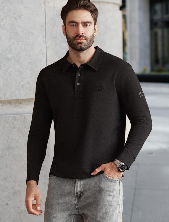 Стильный лонгслив черного цвета с воротником поло выполнен из премиального хлопка в сочетании с эластаном . Натуральная ткань обеспечивает легкость, воздухопроницаемость и приятные тактильные ощущения даже когда жарко, позволяет не перегреваться и поддерживает комфортный микроклимат в течение всего дня. Удобный отложной воротник на аккуратных пуговицах делает образ современным и стильным, а длинный рукав защищает руки при ветреной погоде. Поло хорошо садится по фигуре благодаря добавлению эластичных волокон — такой вариант подходит для мужчин любого роста и размеров, не стесняет движений и создает ощущение свободы и легкости.