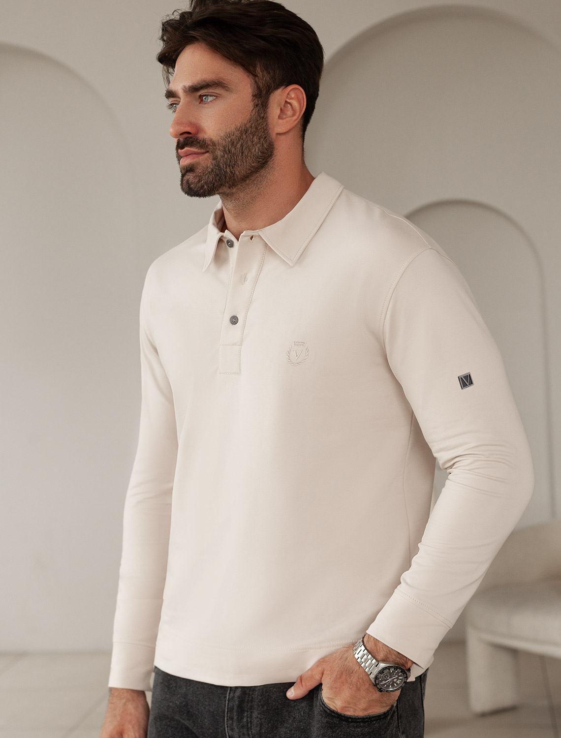 Стильный лонгслив светло-бежевого цвета с воротником поло выполнен из премиального хлопка в сочетании с эластаном . Натуральная ткань обеспечивает легкость, воздухопроницаемость и приятные тактильные ощущения даже когда жарко, позволяет не перегреваться и поддерживает комфортный микроклимат в течение всего дня. Удобный отложной воротник на аккуратных пуговицах делает образ современным и стильным, а длинный рукав защищает руки при ветреной погоде. Поло хорошо садится по фигуре благодаря добавлению эластичных волокон — такой вариант подходит для мужчин любого роста и размеров, не стесняет движений и создает ощущение свободы и легкости.