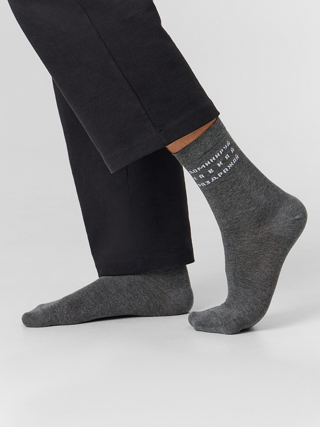 рис.3031 Мужской носок классический, высокий, с рисунком в виде надписи "Доминируй...". т.серый меланж