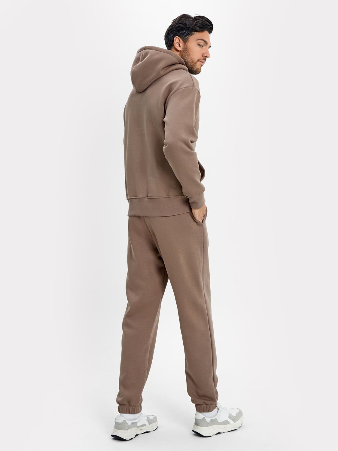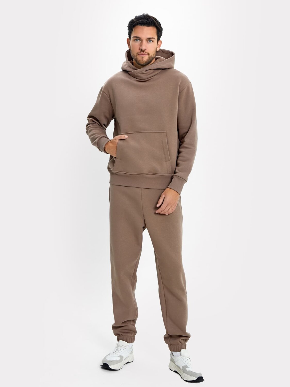 Комплект выполнен из трикотажного полотна футер. Анорак прямого силуэта, перед и спинка цельнокроеные. Круглый вырез горловины, с капюшоном.