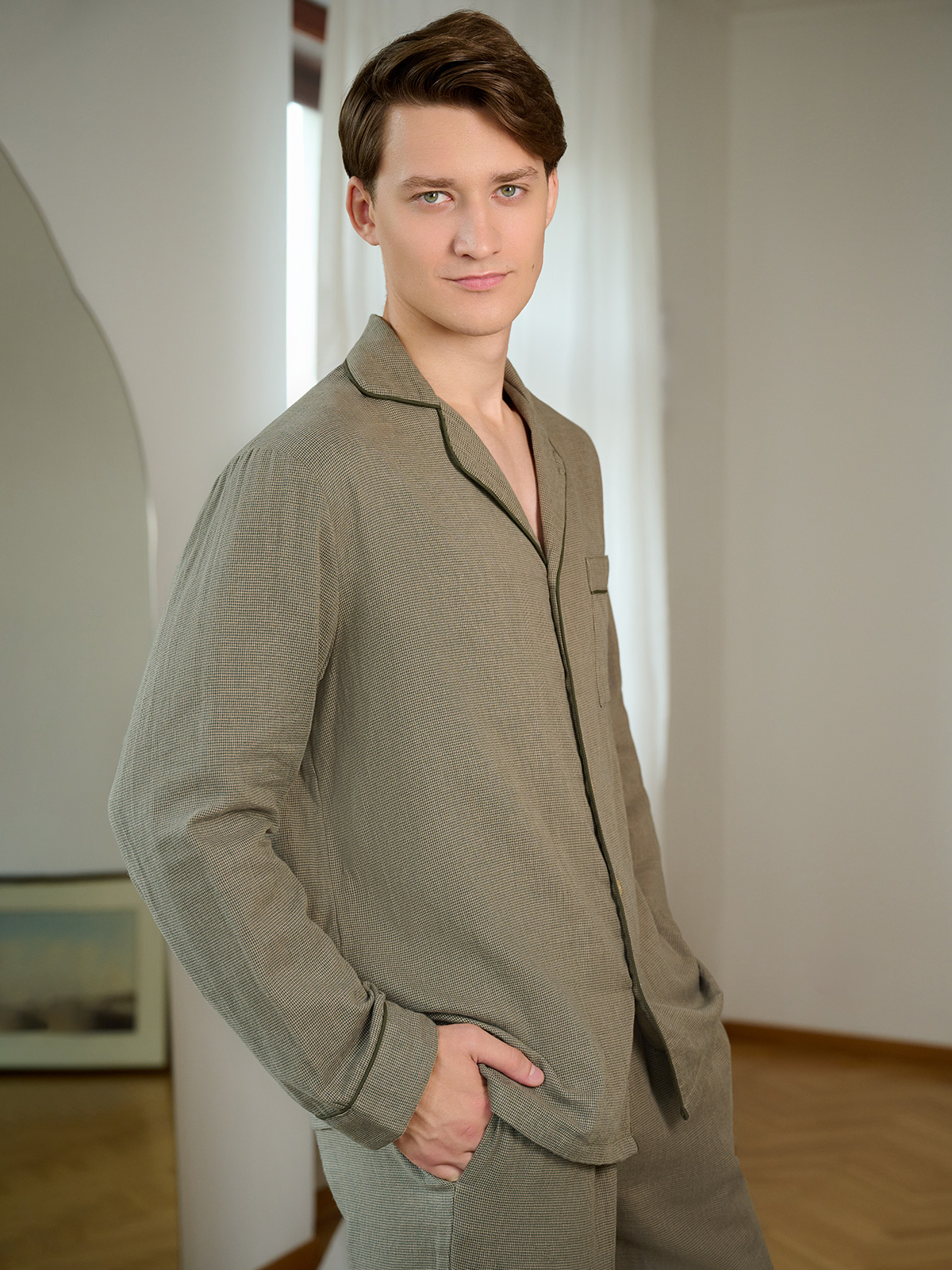 В комплект входит рубашка и брюки оливкового цвета с мелким текстурным узором.