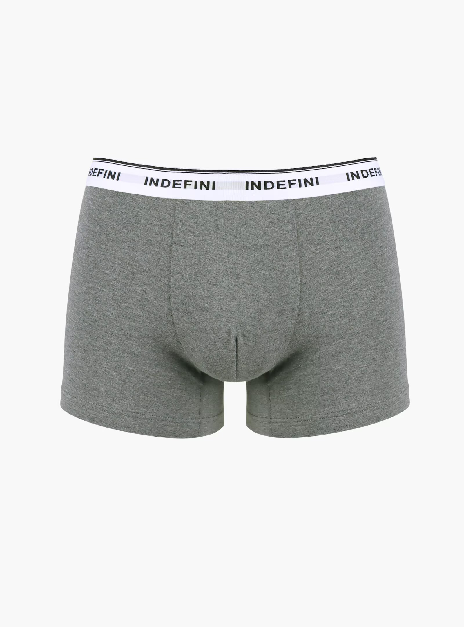Трусы средней посадки с широкой эластичной резинкой на талии белого цвета, украшенной повторяющимся логотипом бренда «INDEFINI» чёрным шрифтом.
