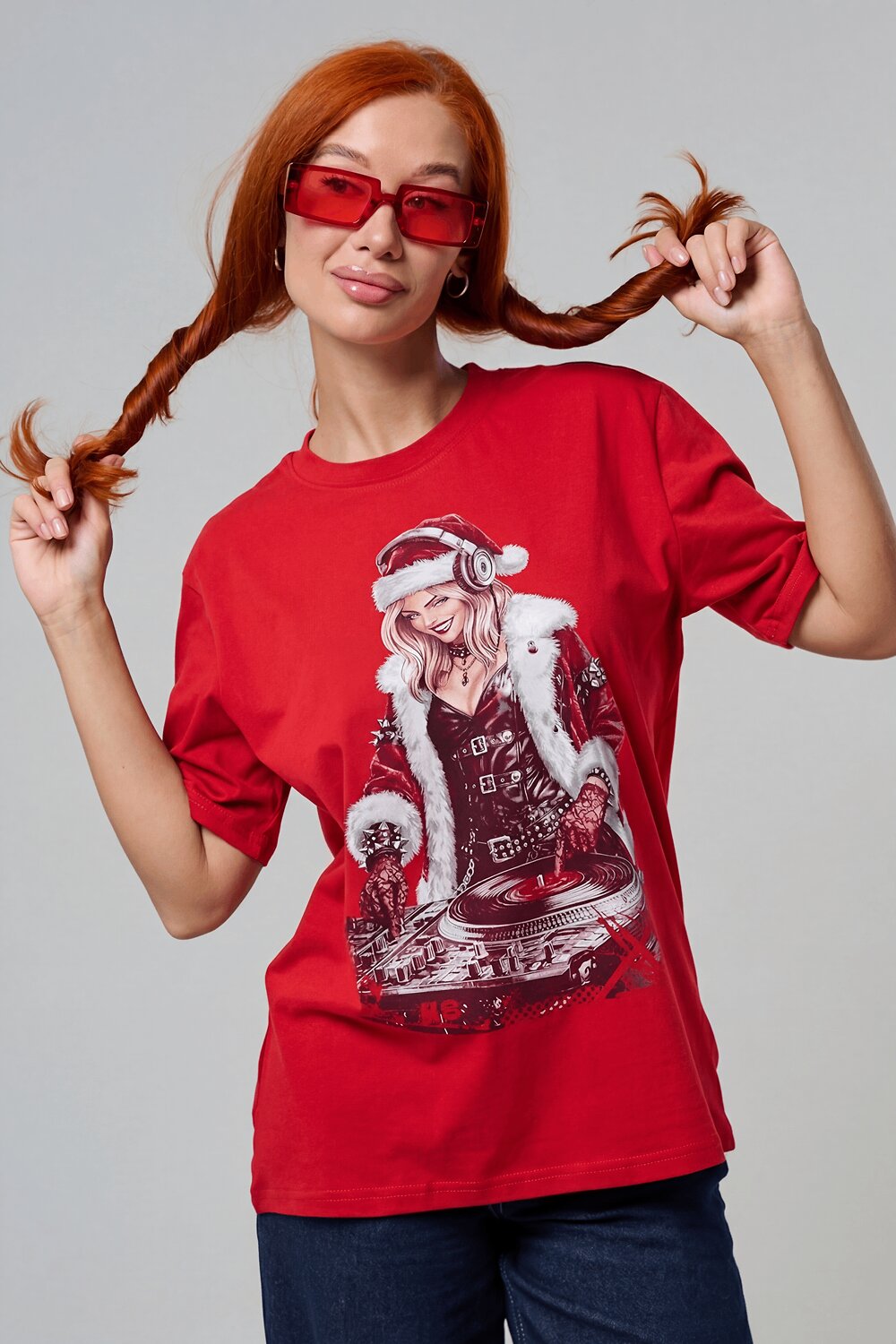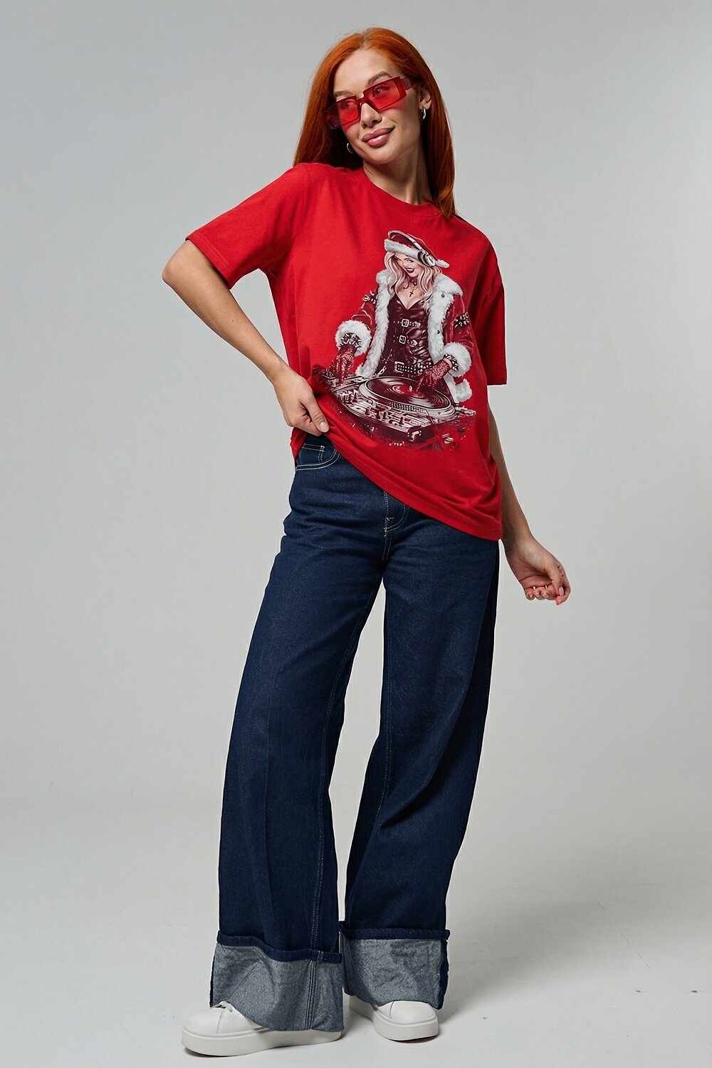 Погрузитесь в магию праздника с нашей стильной oversize-футболкой Санта-Диджей! Эта яркая красная футболка создана для тех, кто любит миксовать новогоднюю атмосферу с ритмом музыки. Главная героиня принта соблазнительная Санта в меховой накидке, с красной шапкой и наушниками, уверенно стоящая за диджейским пультом. Её образ сочетает классический рождественский стиль с современным уличным вайбом: белый мех, чёрная кожаная одежда и динамичная поза, полная энергии.