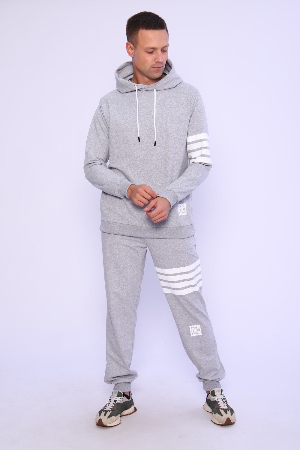 Спортивный мужской костюм отлично подойдет для тренировок дома и игр на улице. Этот модный, мягкий трикотажный костюм с прямыми и аккуратными швами. Толстовка прямого силуэта с двойным капюшоном и карманом кенгуру. Брюки на манжете с карманами в боковых швах.