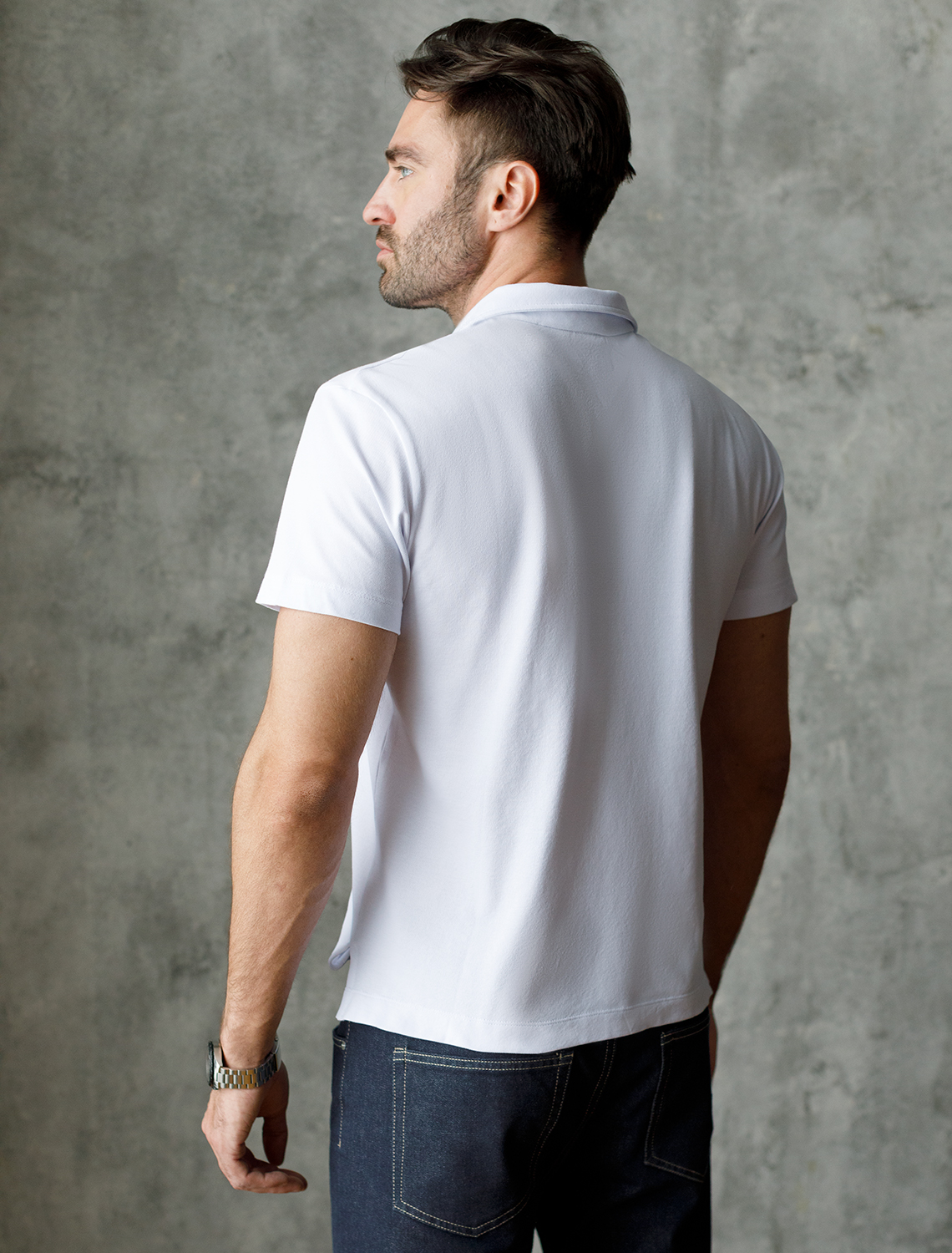 Поло выполнено из фактурного хлопка, которое обеспечивает комфорт даже в жаркое время года и почти не мнется. Контрастная планка застегивается на матовые серебряные пуговицы с логотипом бренда. Преимущество изделия — это добавление эластана в классический для поло материал «пике», что гарантирует безупречный комфорт и долговечность. Поло сочетается в паре со светлым денимом и чиносами, в офис с черными брюками.