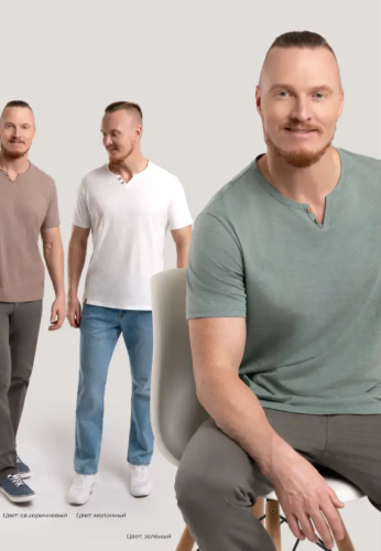 "Описание: Футболка мужская с округлой горловиной и планкой из фактурного полотна флам. Данная модель прекрасно комбинируется с джинсами или шортами. Отличное решение на лето для прогулок с друзьями или поездки на отдых.