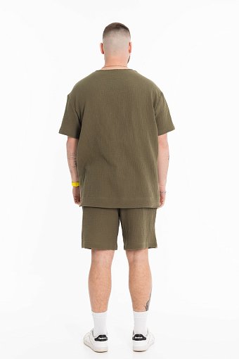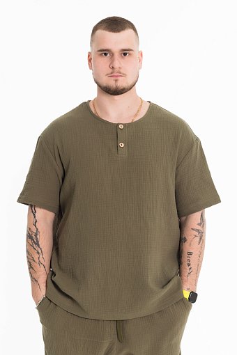 Мужская футболка выполнена из хлопкового полотна - муслина. Силуэт футболки свободный, линия плеча спущена. Круглый вырез горловины с застёжкой на две пуговицы, низ футболки разноуровневый.