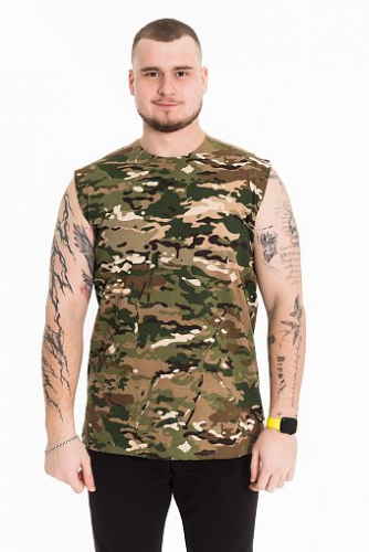 Майка выполнена из однотонной кулирки. Майка с углубленной проймой, спереди нанесён принт.