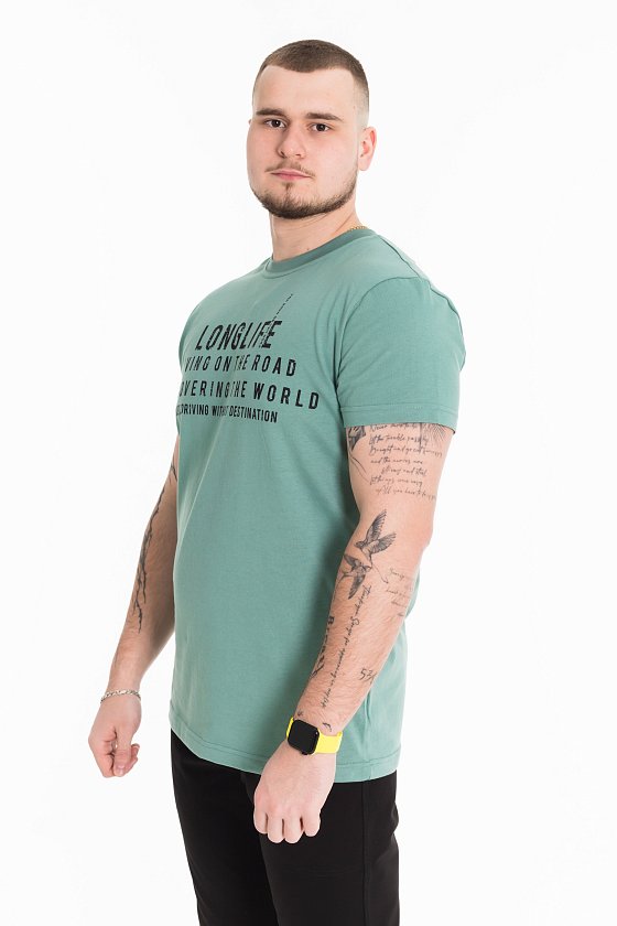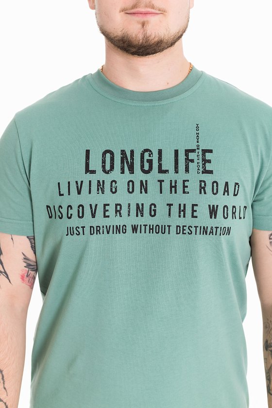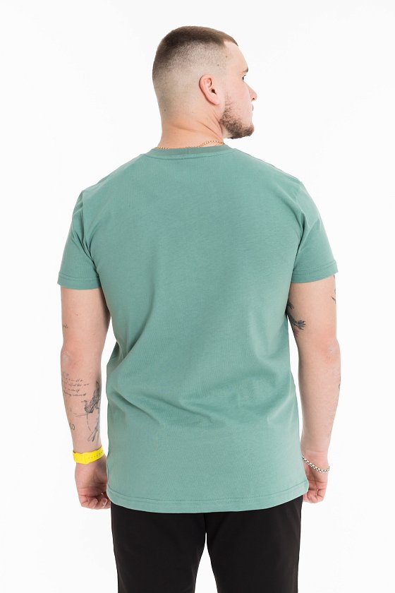 Футболка мужская, выполнена из однотонной хлопковой ткани. Свободного кроя, короткий рукав. Горловина с круглым вырезом, отделанным планкой. Спереди нанесён принт.