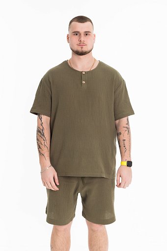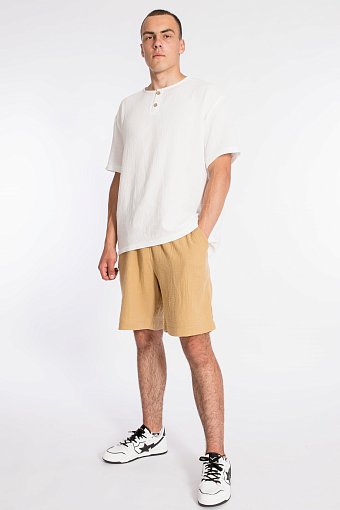 Шорты мужские выполнены из муслина. С боковыми карманами и притачным поясом на резине и шнуре.