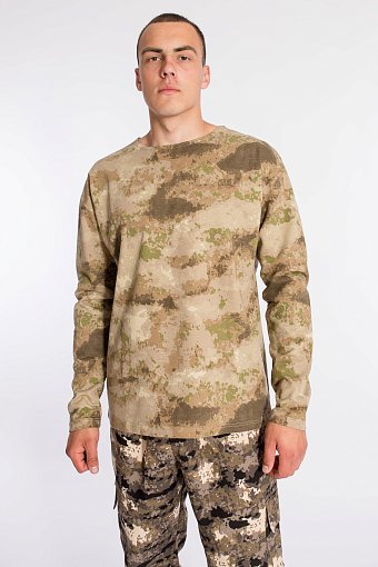Тельняшка мужская выполнена из полотна с начёсом. Покрой свободный, горловина с круглым вырезом, длинный рукав.