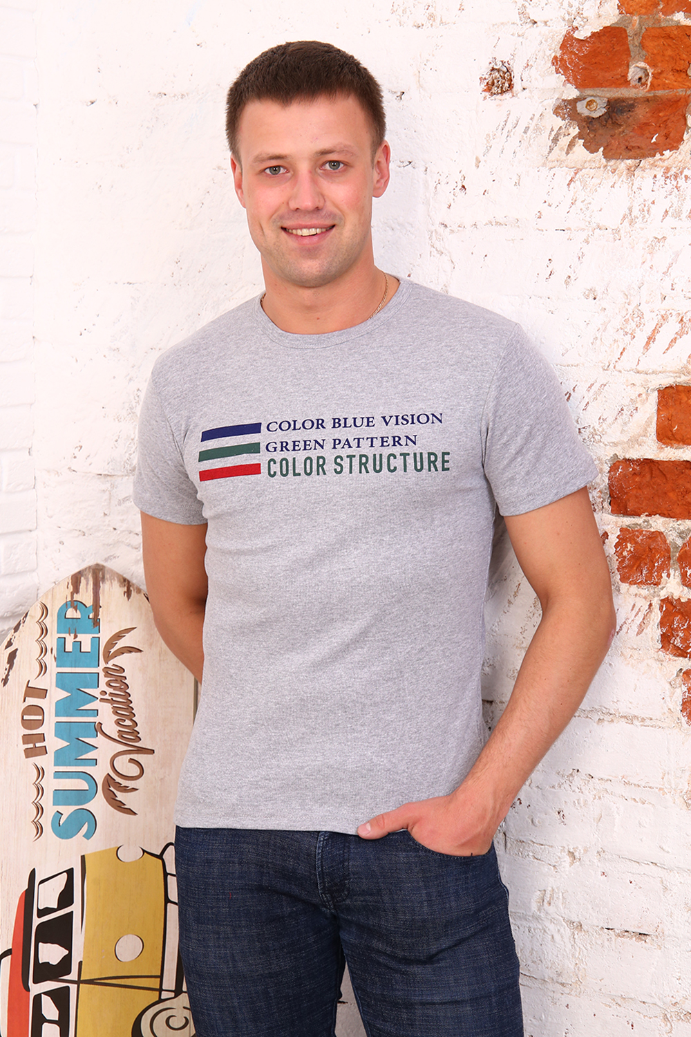 Мужская футболка из кулирки. Короткие рукава, круглая горловина, прямой силуэт. Полочка украшена печатью. Подойдет на любой случай жизни.