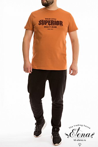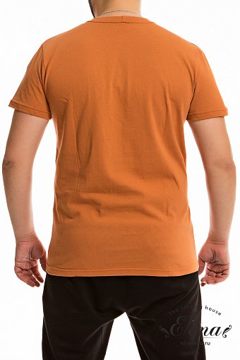 Футболка из однотонной кулирки с принтом спереди. Круглый вырез горловины оформлен планкой из рибаны.