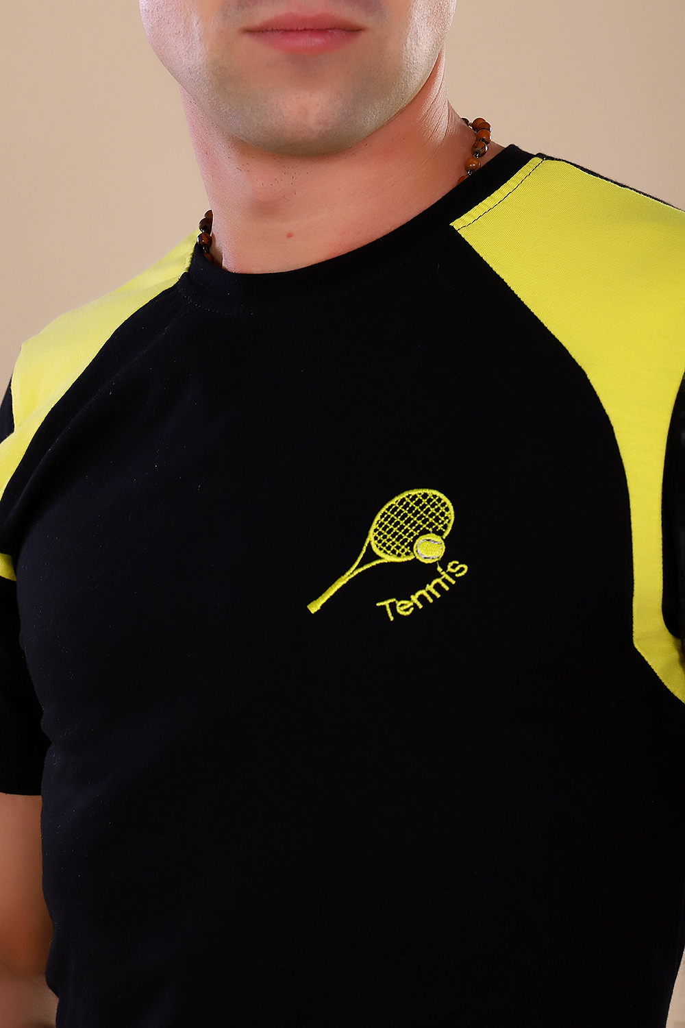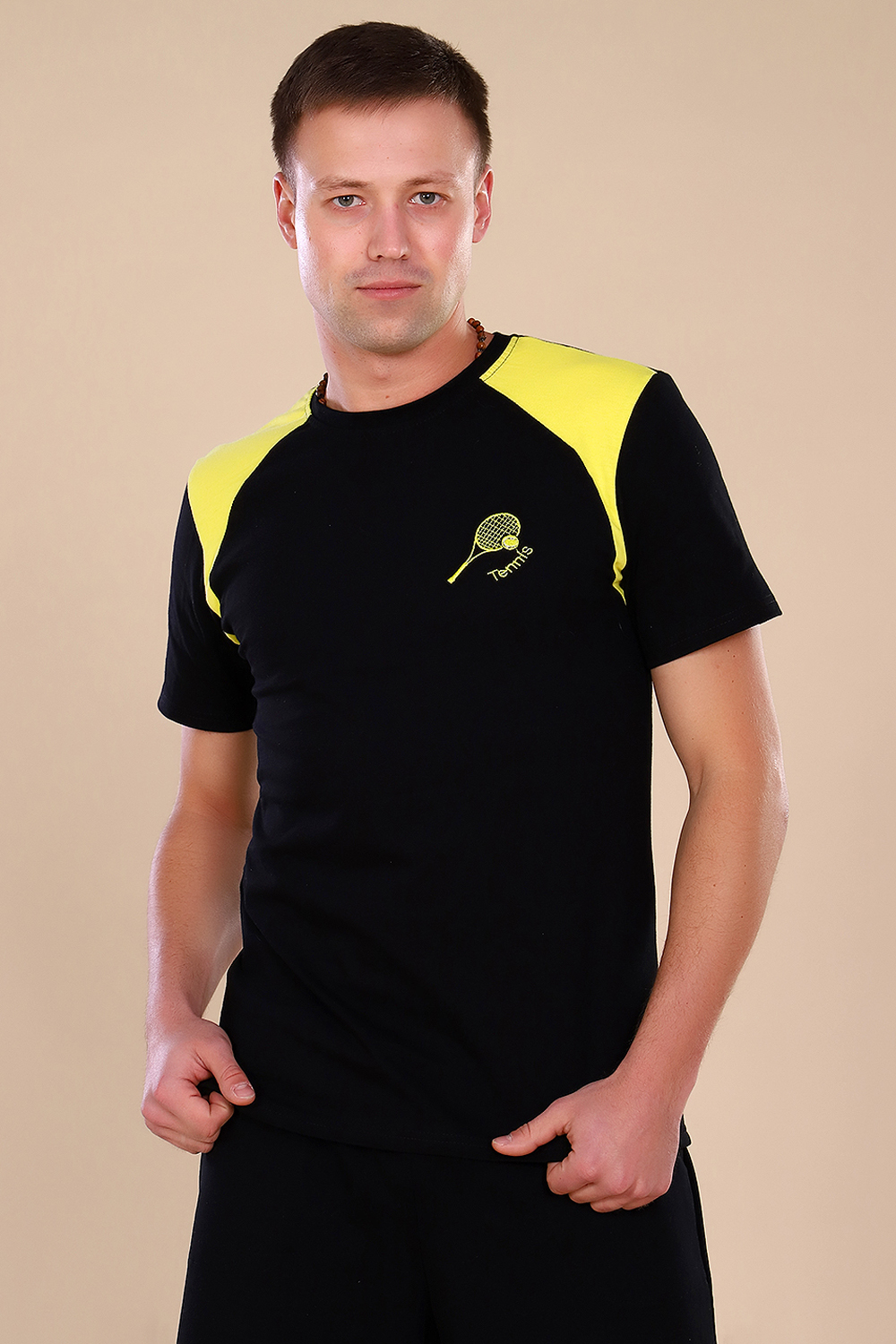 Футболка мужская комбинированная с коротким со втачным рукавом. Данная модель выполнена из трикотажного полотна (кулирка 100% хлопок с плотностью 180гр.). Горловина обработана трикотажным эластичным полотном (рибана с лайкрой). На полочке присутствует отрезная вставка и вышивка с символикой вашего любимого спорта (теннис). Отлично подходит для прогулок и отдыха и спорта. Цвет: черный; Материал: кулирка;кулирка; Состав: хлопок 100%.