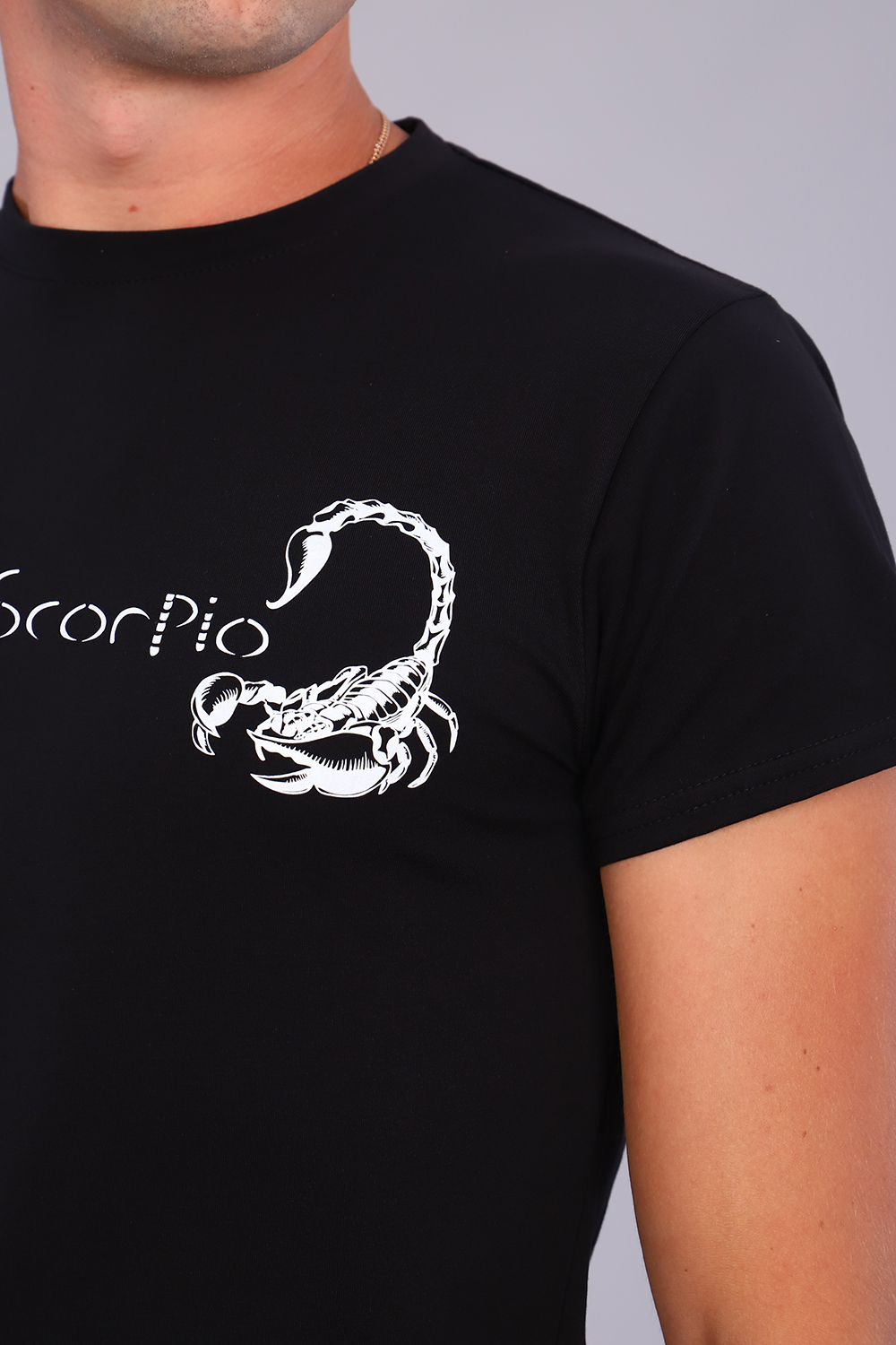 Футболка мужская с принтом в виде скорпиона из кулирки с лайкрой высокого качества пенье. Модель прямого покроя, с коротким рукавом и усиленным плечевым швом. Футболка - незаменимый предмет в мужском гардеробе. Футболку носят дома, на отдыхе, с помощью футболки создают стильные образы. Цвет: черный; Материал: кулирка с лайкрой пенье;кулирка с лайкрой пенье; Состав: хлопок 94%, лайкра 6%.